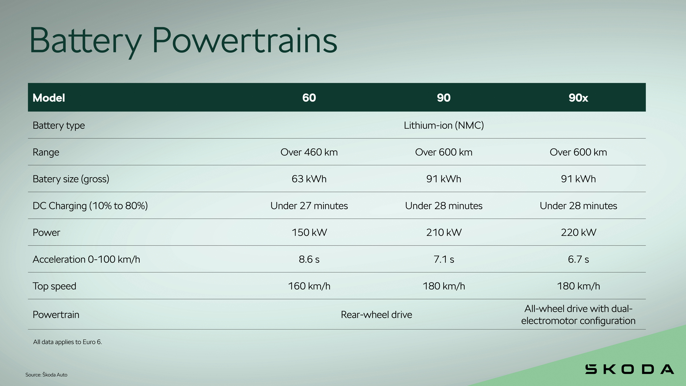 Auch beim Antrieb positioniert Skoda den Peaq klar als Langstrecken-Fahrzeug. Den Einstieg markiert das Modell 60 mit einer 63-kWh-Batterie, Heckantrieb und 150 kW Leistung, was für über 460 Kilometer Reichweite sorgt. Darüber rangieren die großen Versionen 90 und 90x, die beide aus einem mächtigen 91-kWh-Akku schöpfen und Reichweiten von mehr als 600 Kilometern ermöglichen. Während das Modell 90 mit 210 kW über die Hinterräder angetrieben wird, bietet die Topversion 90x mit 220 kW einen Allradantrieb durch zwei Elektromotoren. An der Schnellladesäule lassen sich alle Batterievarianten in unter 28 Minuten von 10 auf 80 Prozent aufladen.