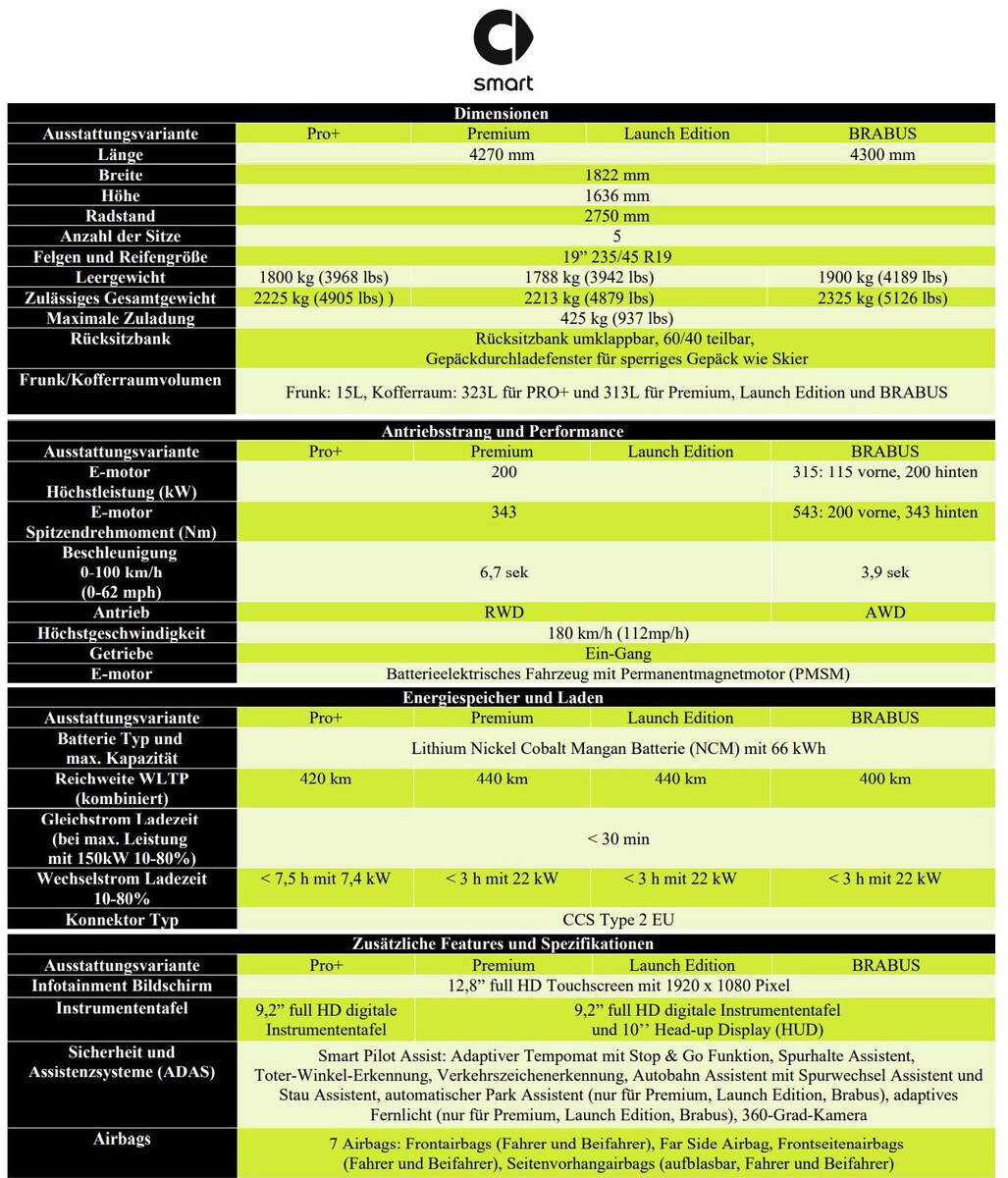 Erste Testfahrten im Smart #1 bescheinigen dem Smart #1 ein komfortable Ausstattung und gelungene Abstimmung. Kritik gibt es am überfrachteten Infotainmentsystem. In der Pro+-Variante verfügt der Smart #1 bereits über verschiedene Fahrassistenzsysteme, 360-Grad-Kamera, intelligente Sprachunterstützung, LED-Scheinwerfer und eine elektrische Heckklappe. Der Smart #1 Premium hat dann zusätzlich ein Soundsystem von Beats, ein Head-Up Display (HUD), CyberSparks+ LED-Matrix-Scheinwerfer und einen automatischen Park-Assistenten.