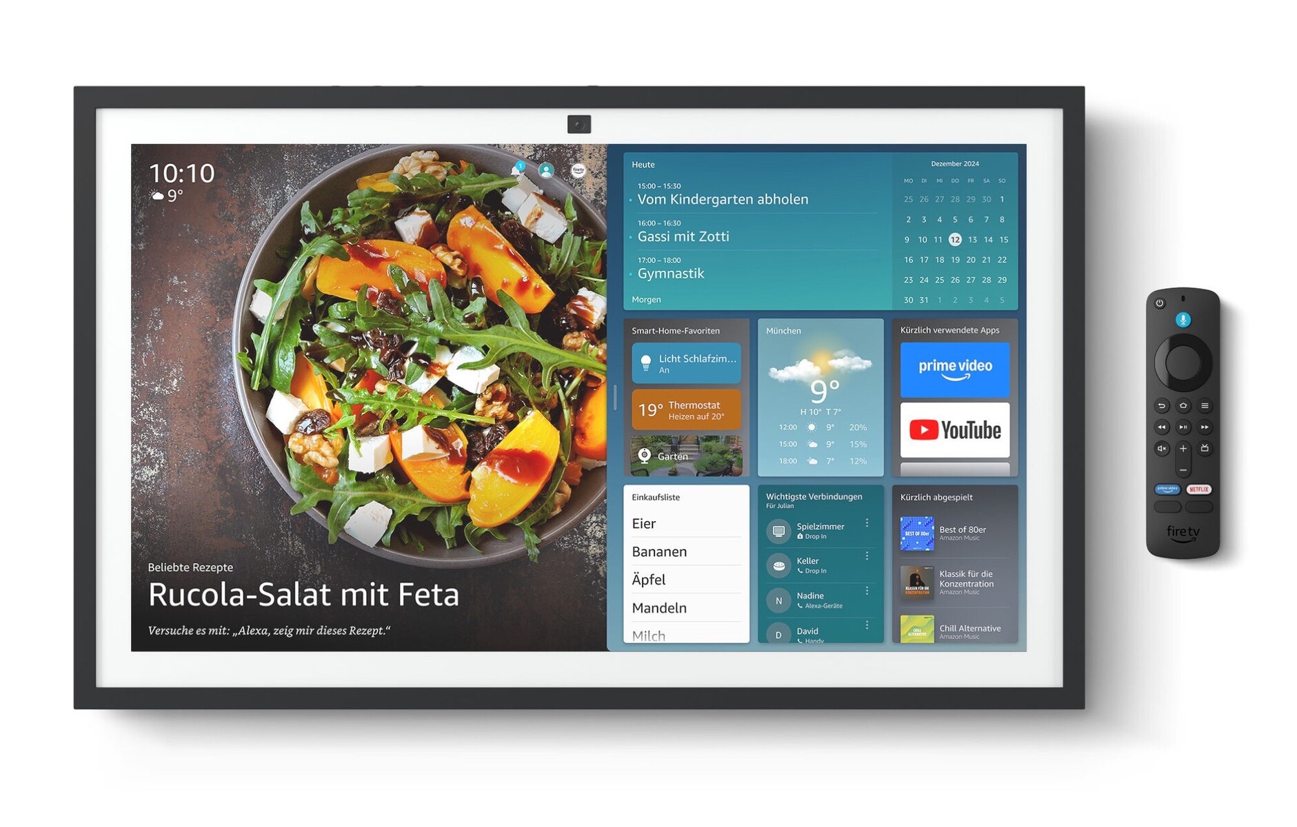 Durch Fire TV und die mitgelieferte Fernbedienung lassen sich die beiden Geräte auch als Smart TV verwenden, und unterstützen dazu die gängigsten Streaming-Apps, inklusive Netflix, Disney+ und YouTube. Amazon erlaubt Nutzern, den Home-Bildschirm mit praktischen Widgets zu personalisieren, um etwa Einkaufslisten, Kalendereinträge oder auch Steuerelemente für Smart-Home-Geräte darzustellen, oder direkt Musik oder einen Podcast zu starten. Die neuen Modelle besitzen Wi-Fi 6E und eine verbesserte 13 MP Kamera mit mehr als doppelt so großem Sichtfeld und der Option, den Nutzer automatisch in der Bildmitte zu behalten, wofür Amazon auf bis zu 3,3-fachen digitalen Zoom zurückgreift.