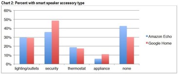 70 Prozent der Besitzer eines Google Home in USA und 60 Prozent mit einem Amazon Echo nutzen in Kombination mit ihrem smarten Lautsprecher ebenfalls mindestens ein Accessoires fürs Smart Home. 49 % der Google-Home-Nutzer und 36 % der Amazon-Echo-Besitzer steuern darüber auch Sicherheitshardware wie Alarmanlagen oder Videokameras.