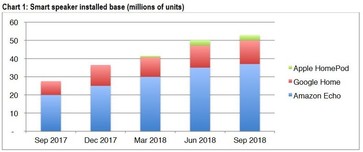 Die US-Marktforscher von Cirp haben sich die installierte Smart-Speaker-Basis für das September-Quartal 2018 angesehen und festgestellt, dass insgesamt 53 Millionen smarte Lautsprecher in US-Haushalten genutzt werden. Im Juni 2018 waren dies noch rund 50 Millionen. Ein Anstieg um 6 Prozent.