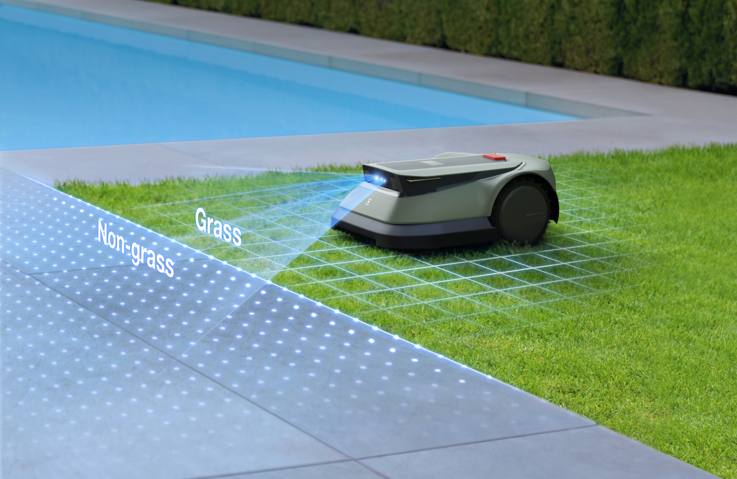 Für die intelligente Navigation und Pfadplanung in Bahnen sowie die Erkennung von Tieren, Schläuchen und anderen Hindernissen nutzt der Mähroboter von Ecovacs eine Kombination aus AIVI 3D mit visuellen und ToF-Sensoren in der Front und einer 150 Grad Weitwinkel-Fischaugenkamera auf der Oberseite. Damit orientiert er sich intelligent auf der zu mähenden Rasenfläche, die allerdings klare Grenzen aufweisen muss. Der Roboter erkennt mit seinen Kameras die Übergänge von Gras zu Terrasse, Beeten und Co und weiß so, wo die Rasenfläche zu Ende ist.