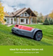 Zu den weiteren Features des smarten Mähroboters RoboUP zählen neben der obligatorischen App-Steuerung unter anderem eine KI-Objekterkennung und Kollisionsvermeidung über eine HD-Kamera und Sensoren, um Menschen, Tiere, Bäume, Spielzeug und Co auszuweichen, Flutlicht sowie eine Diebstahlsicherung. Steigungen meistert er laut Herstellerangaben bis 26 Prozent.