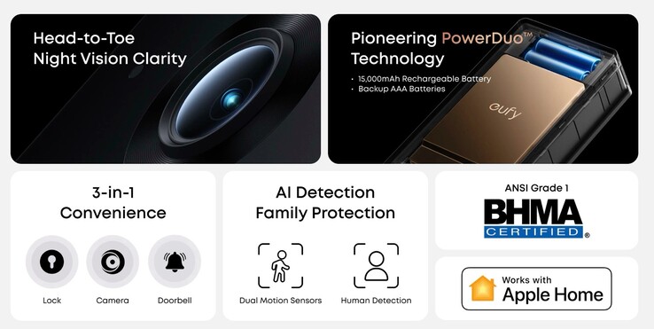 Das smarte Türschloss besitzt einen 15.000 mAh Akku, der je nach Nutzung eine Laufzeit von sechs bis zwölf Monaten ermöglichen soll. Alternativ ist auch der Betrieb durch vier AAA-Batterien möglich, etwa um das Schloss betriebsbereit zu halten, während der Akku geladen wird. Wird das FamiLock S3 Max mit der Eufy Security HomeBase 3 (ca. 139 Euro auf Amazon) kombiniert, kann der lokale Videospeicher erweitert und eine Verbindung zu Amazon Alexa, Google Home und Apple HomeKit hergestellt werden. Durch Matter ist es aber auch ohne HomeBase möglich, das Türschloss in den meisten Smart-Home-Apps zu steuern. Die Verbindung zum Netzwerk erfolgt über Wi-Fi 6.