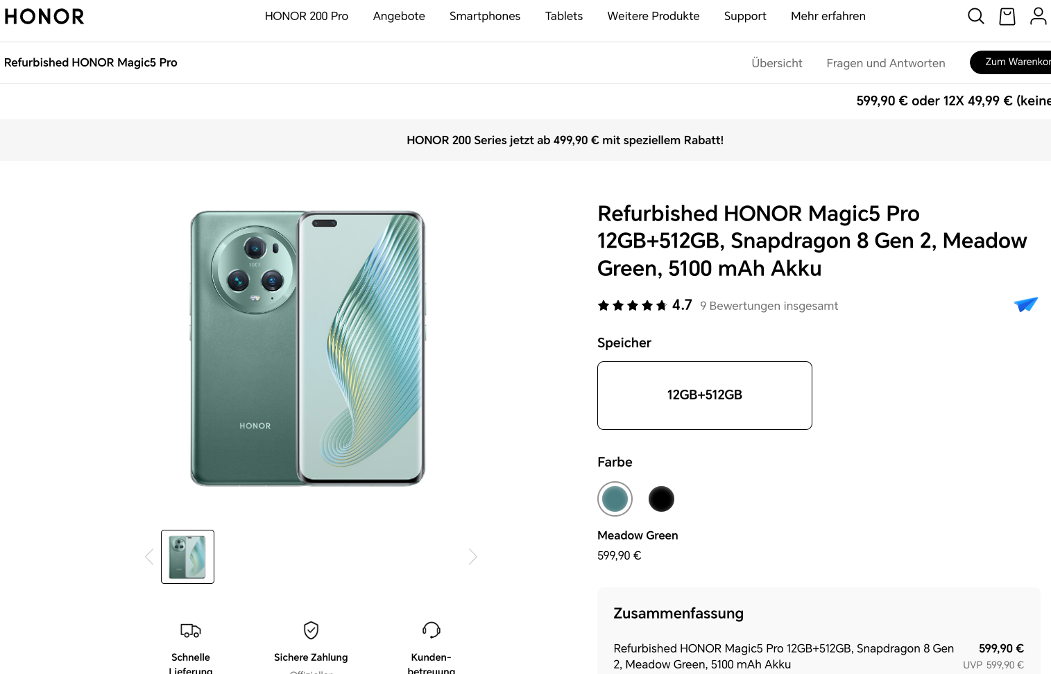 Der Zustand wird von Honor als "Sehr gut" angegeben mit möglicherweise kleineren Schönheitsfehlern. Das Smartphone wird mit Ladekabel und entweder in der OVP oder einer anderen weißen Box geliefert. Der Neupreis des Honor-Smartphones liegt mit 750 Euro um 150 Euro höher.