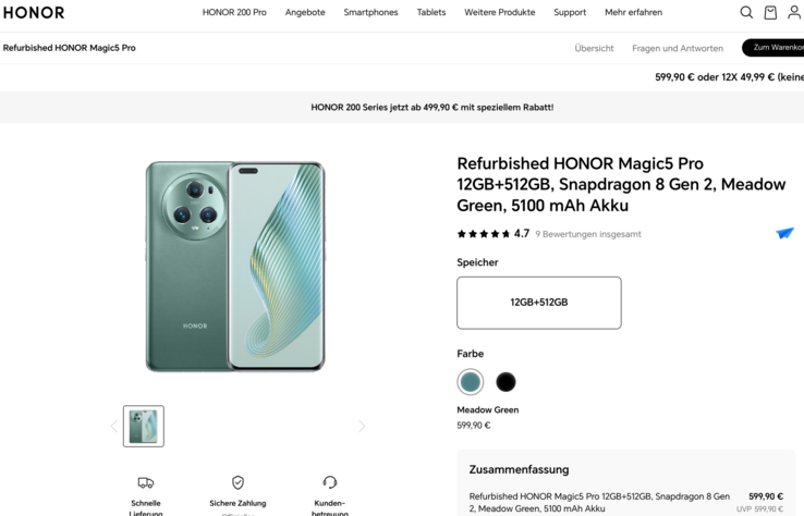 Das Honor Magic5 Pro Highend-Smartphone gibts aktuell schon für 599 Euro im Hersteller-eigenem Refurbish-Deal. Man erhält an Ein 1.300 Nits helles 120Hz OLED-Display, einen Snapdragon 8 Gen 2 SoC, lange Akkulaufzeiten von bis zu 21 Stunden, Updates bis Android 16 sowie Sicherheitsupdates bis 2028.