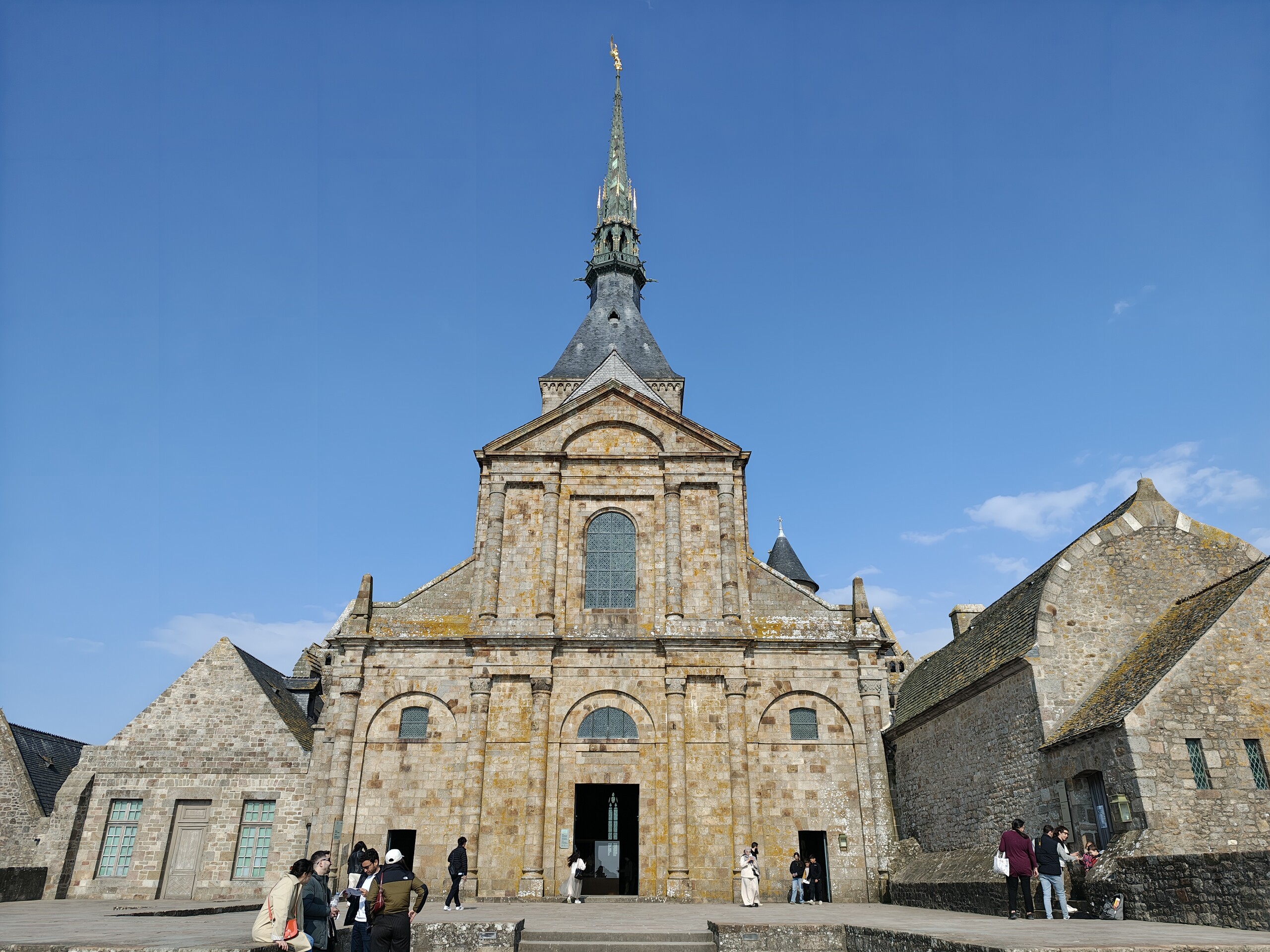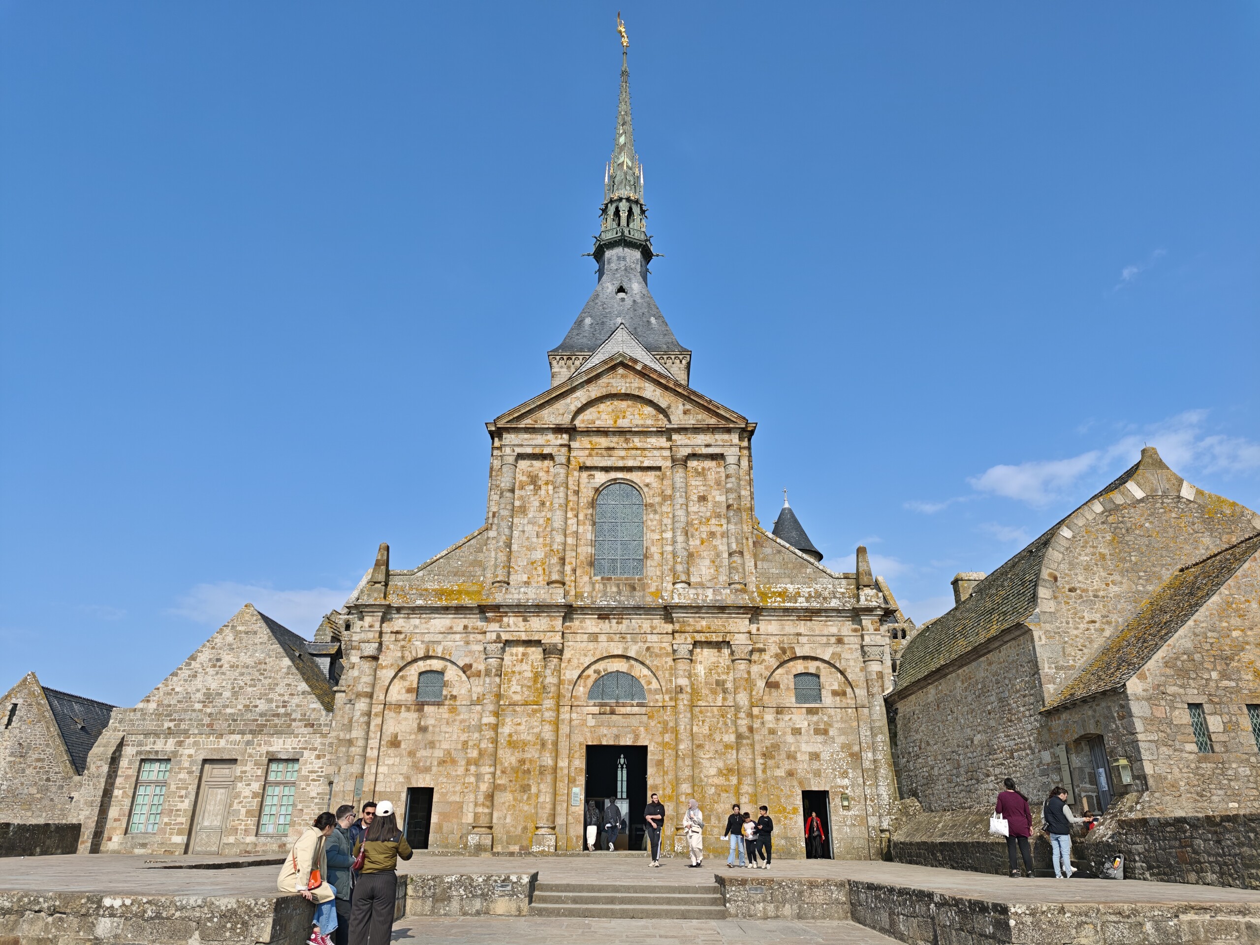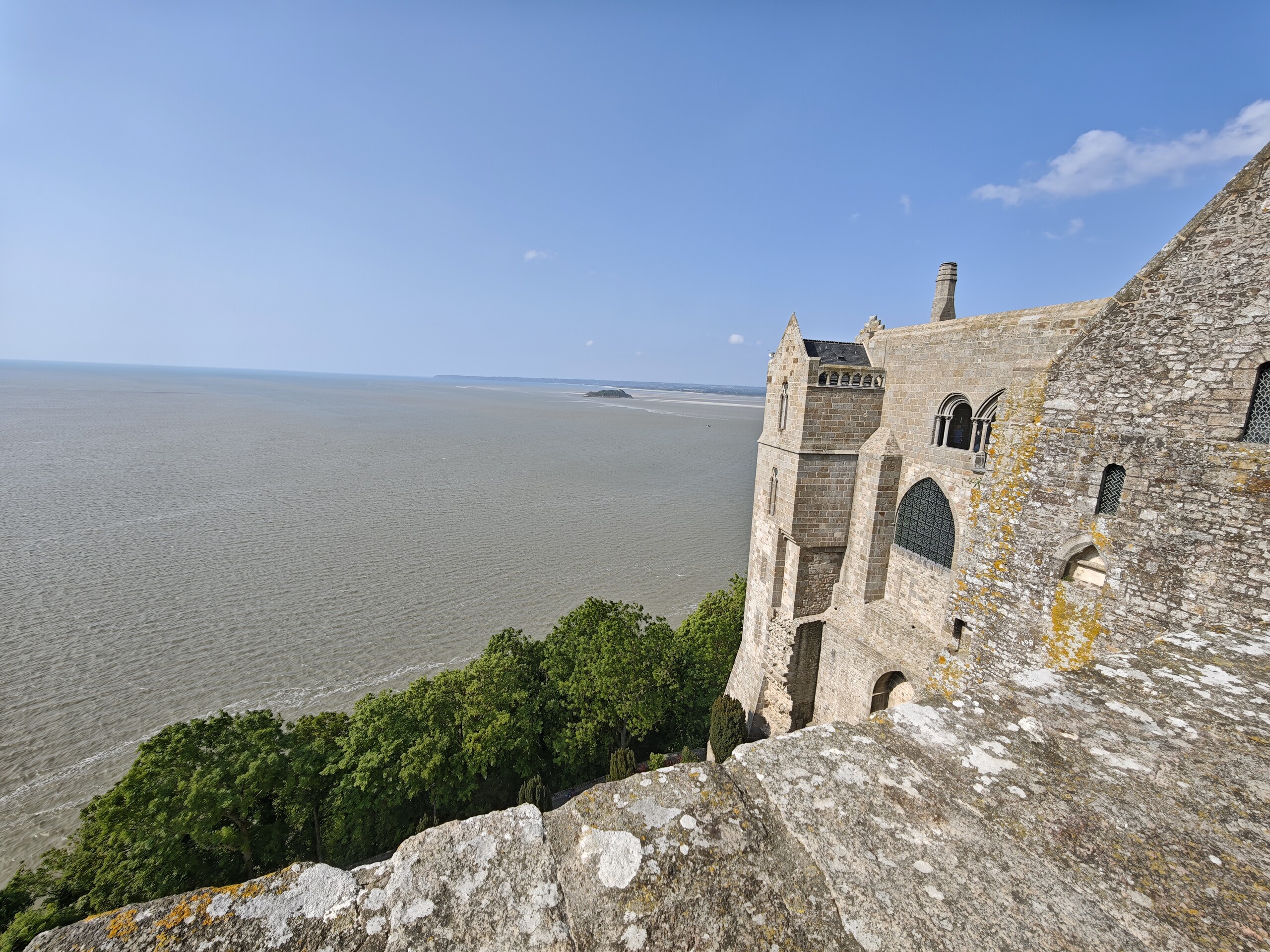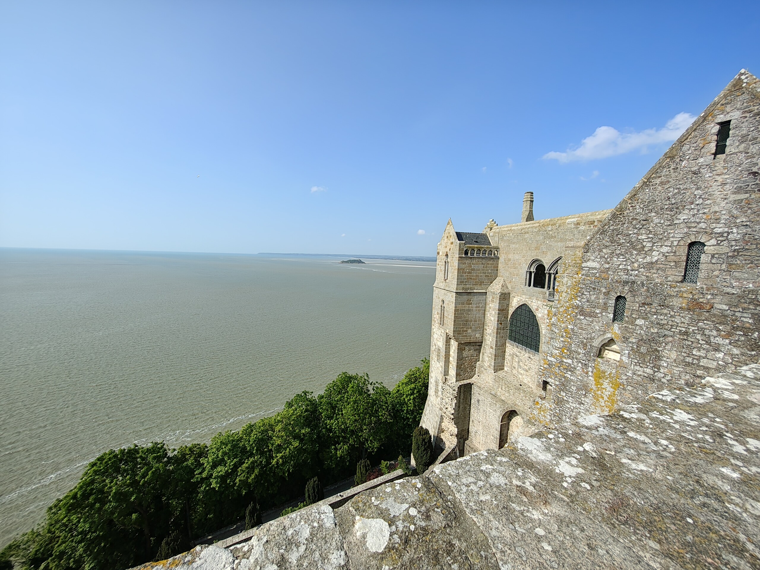Wenn man all die Treppen erklommen hat, steht man vor der Abbaye du Mont-Saint-Michel, dem Kloster, welches auf dem Berg trohnt. Noch ein letztes Mal die mächtige Eingangstreppe hochsteigen und dann ist man ganz oben angekommen. Von der Westterrasse aus hat man einen grandiosen Blick auf den Atlantik und die Küste.