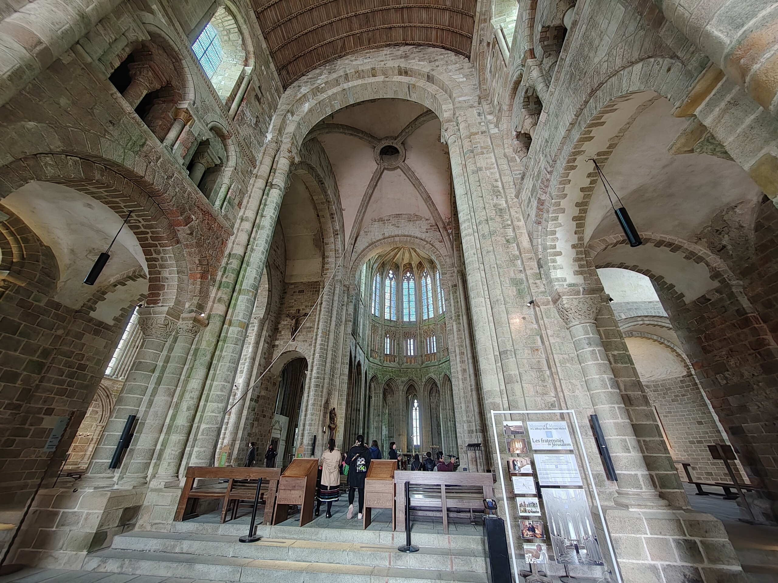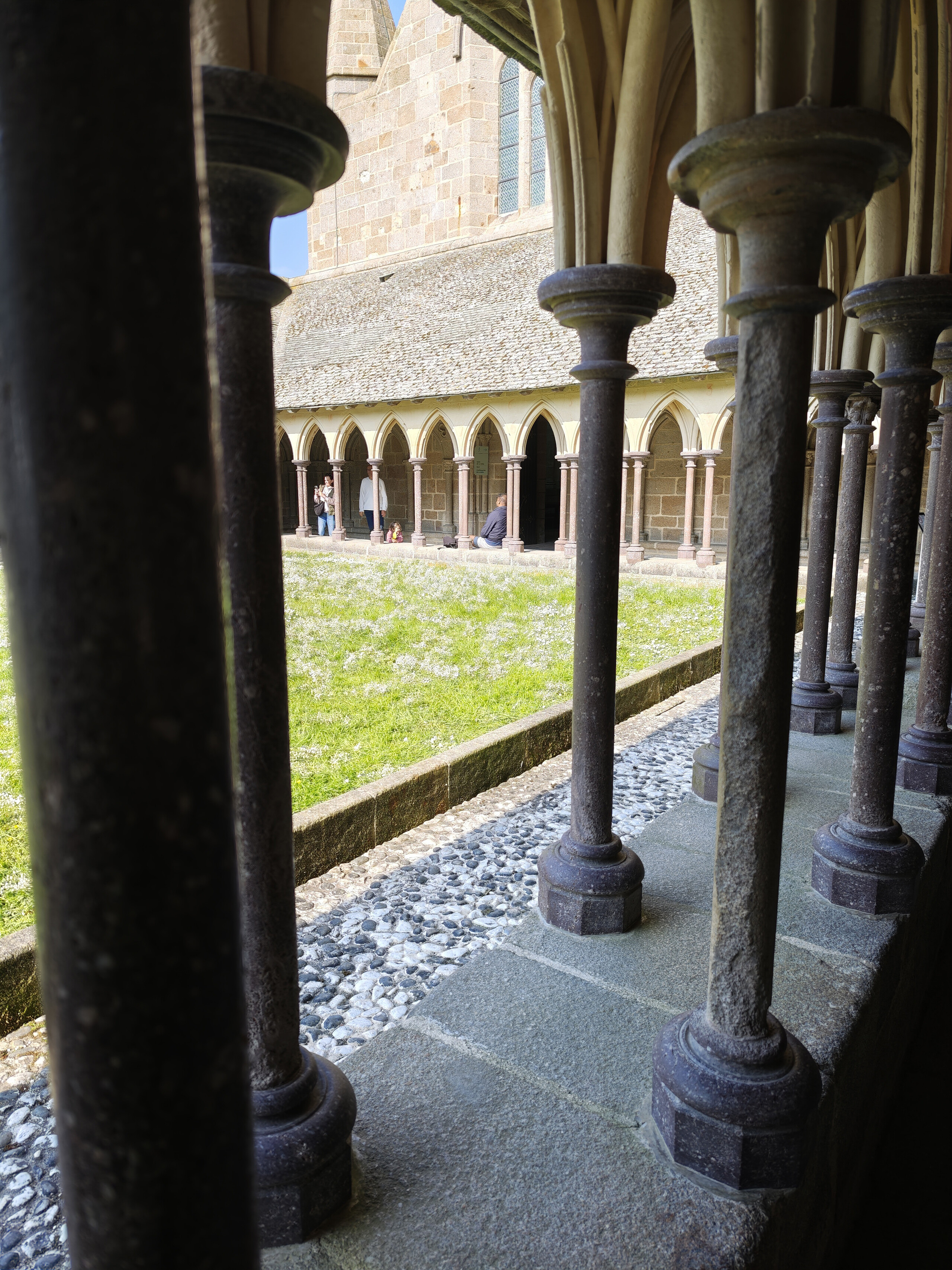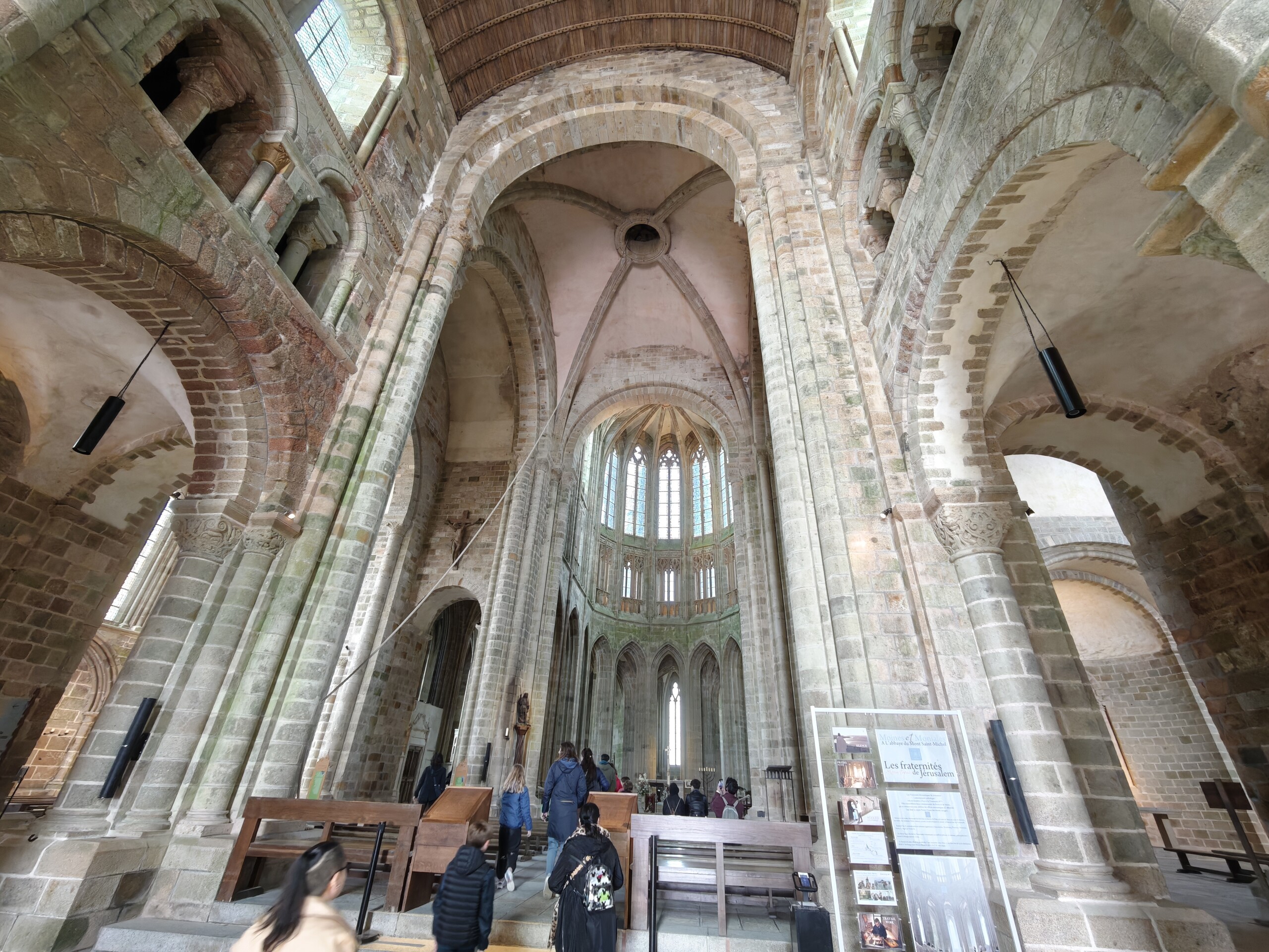 Wenn man all die Treppen erklommen hat, steht man vor der Abbaye du Mont-Saint-Michel, dem Kloster, welches auf dem Berg trohnt. Noch ein letztes Mal die mächtige Eingangstreppe hochsteigen und dann ist man ganz oben angekommen. Von der Westterrasse aus hat man einen grandiosen Blick auf den Atlantik und die Küste.