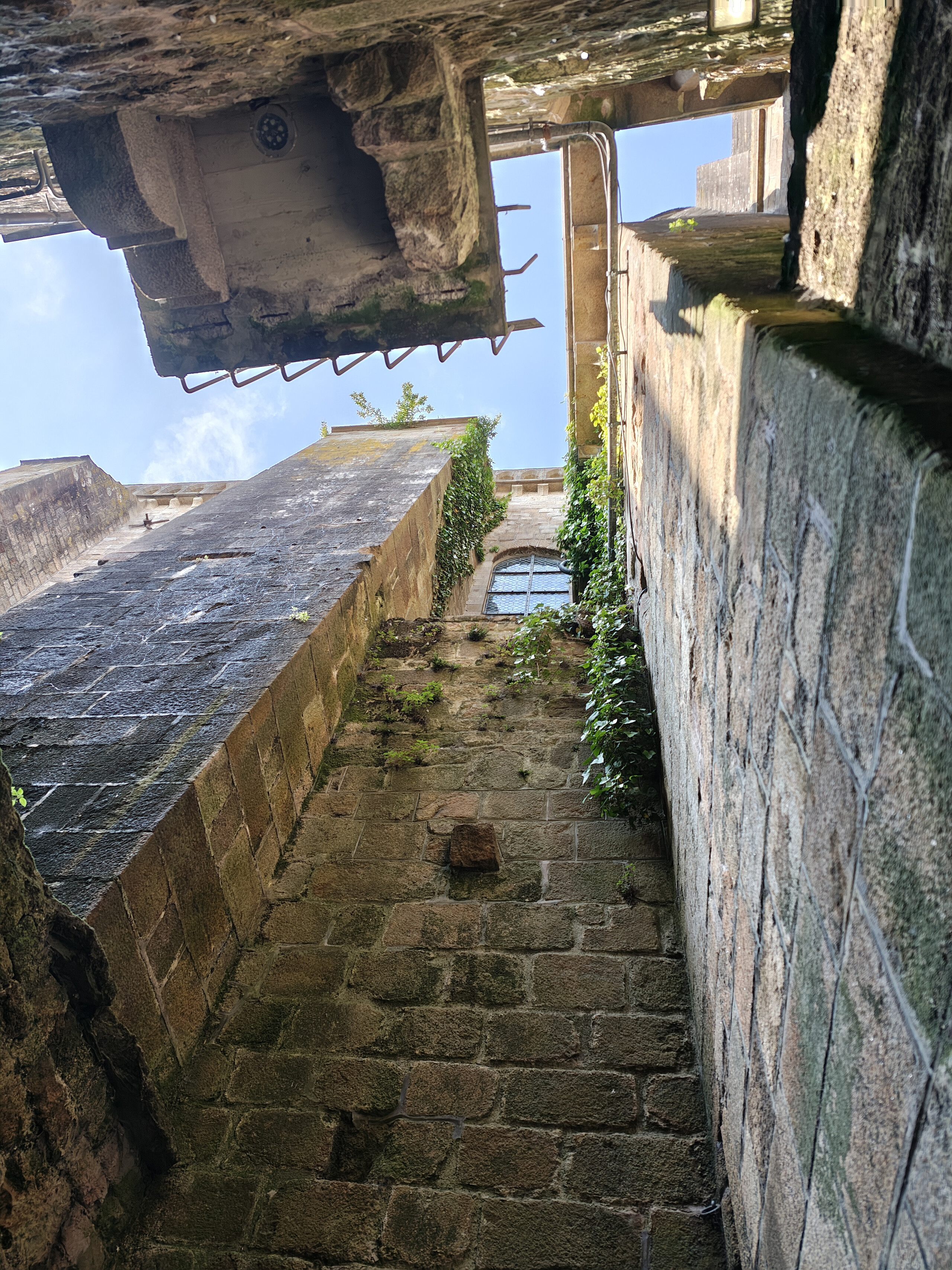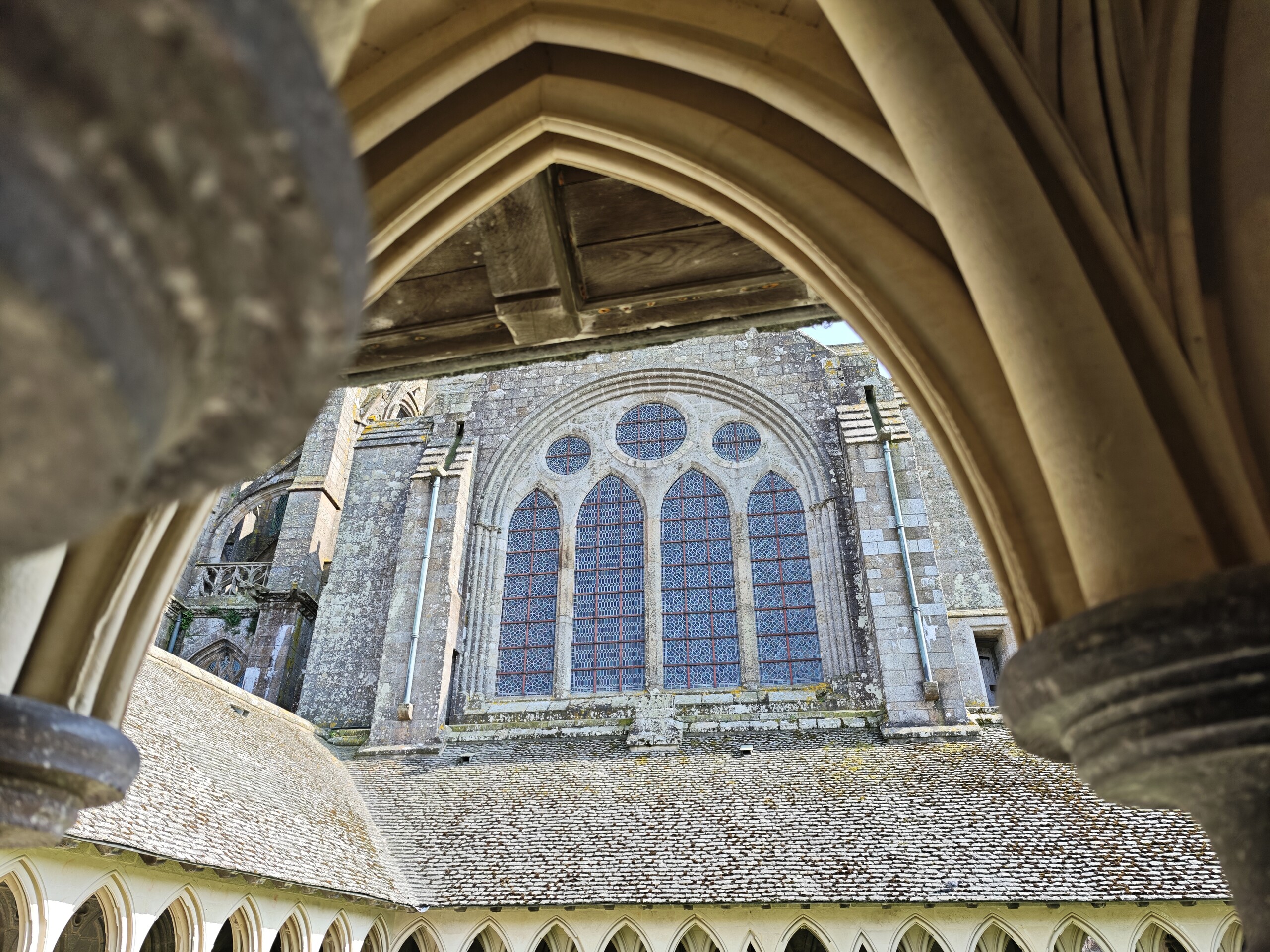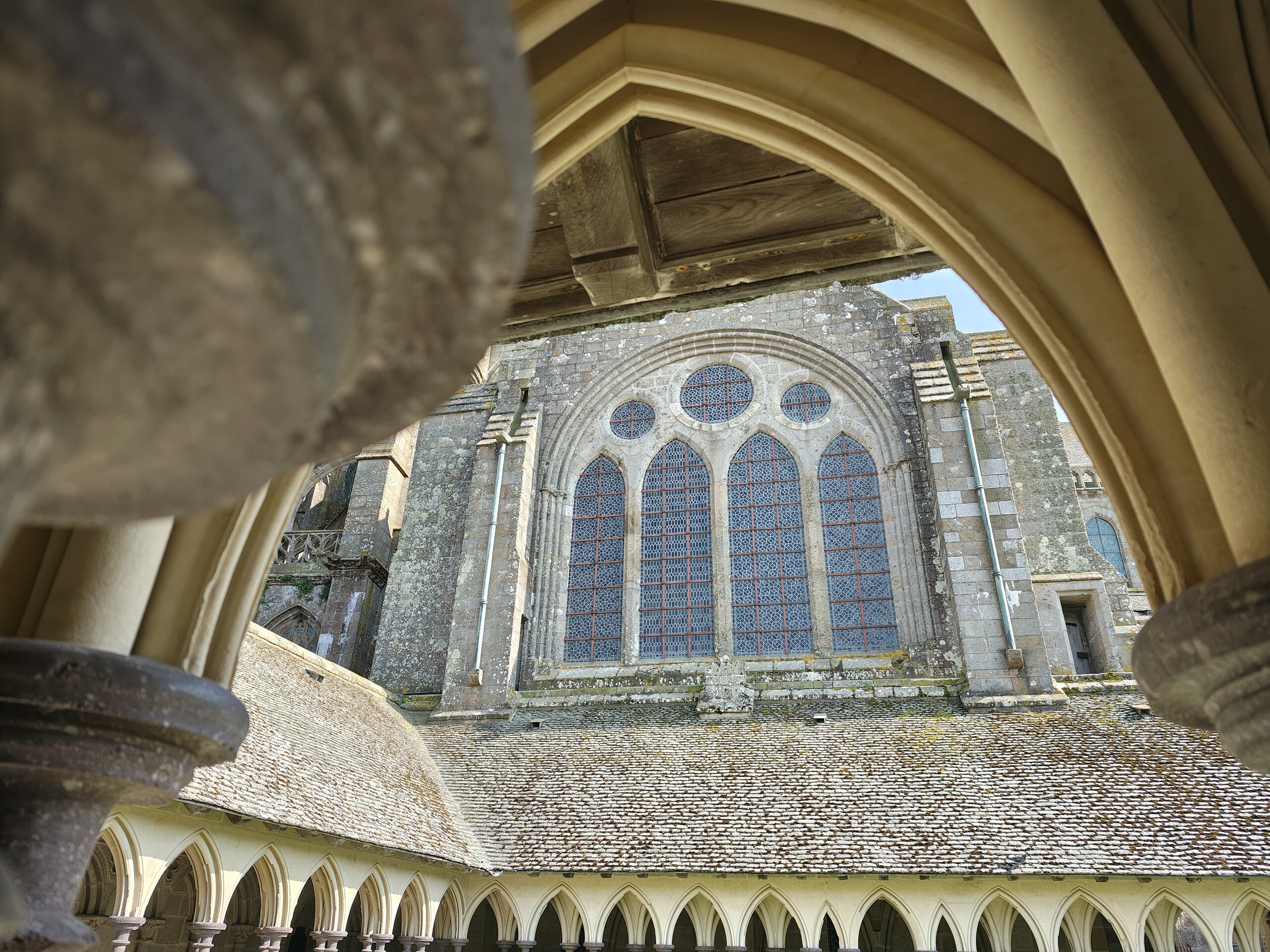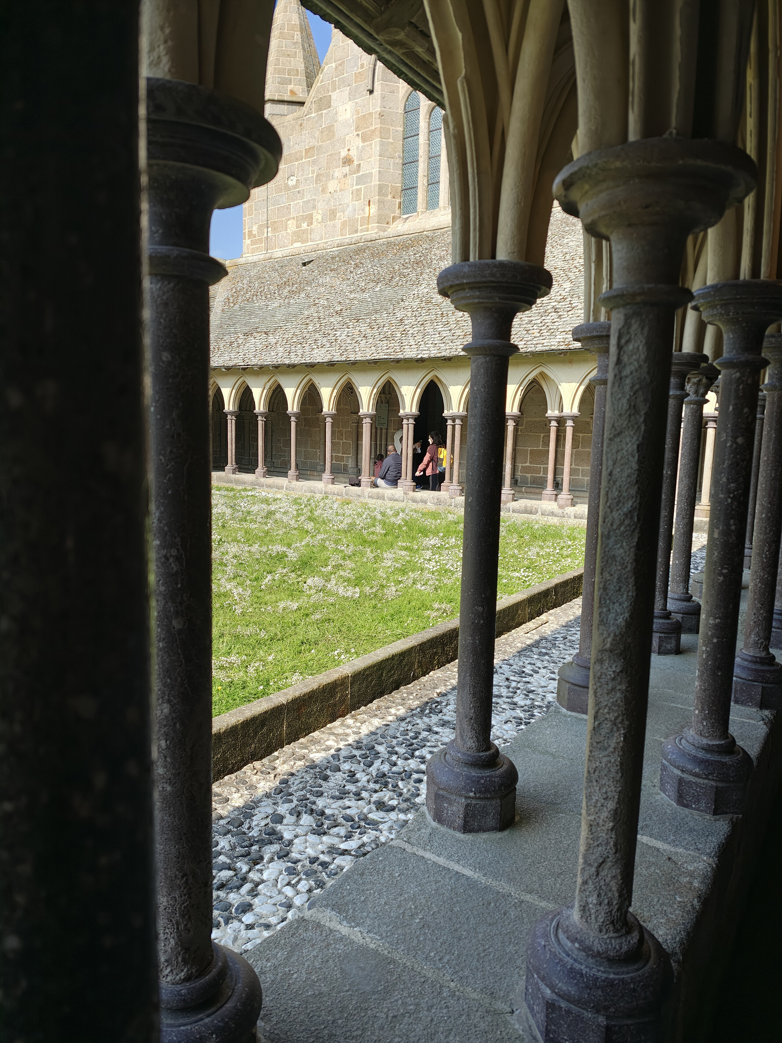 Wenn man all die Treppen erklommen hat, steht man vor der Abbaye du Mont-Saint-Michel, dem Kloster, welches auf dem Berg trohnt. Noch ein letztes Mal die mächtige Eingangstreppe hochsteigen und dann ist man ganz oben angekommen. Von der Westterrasse aus hat man einen grandiosen Blick auf den Atlantik und die Küste.