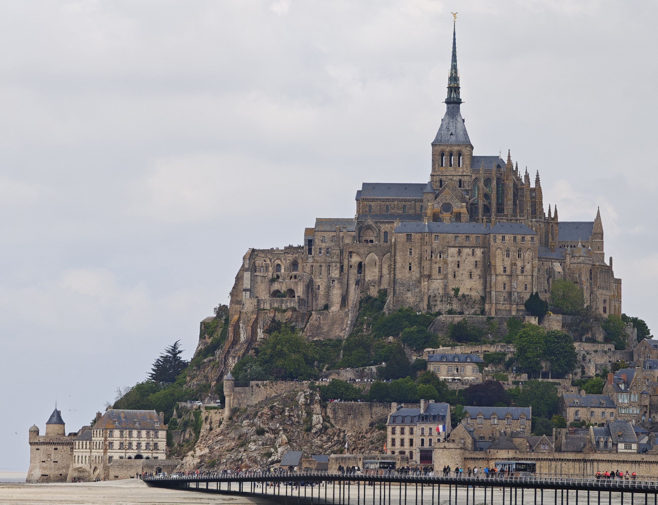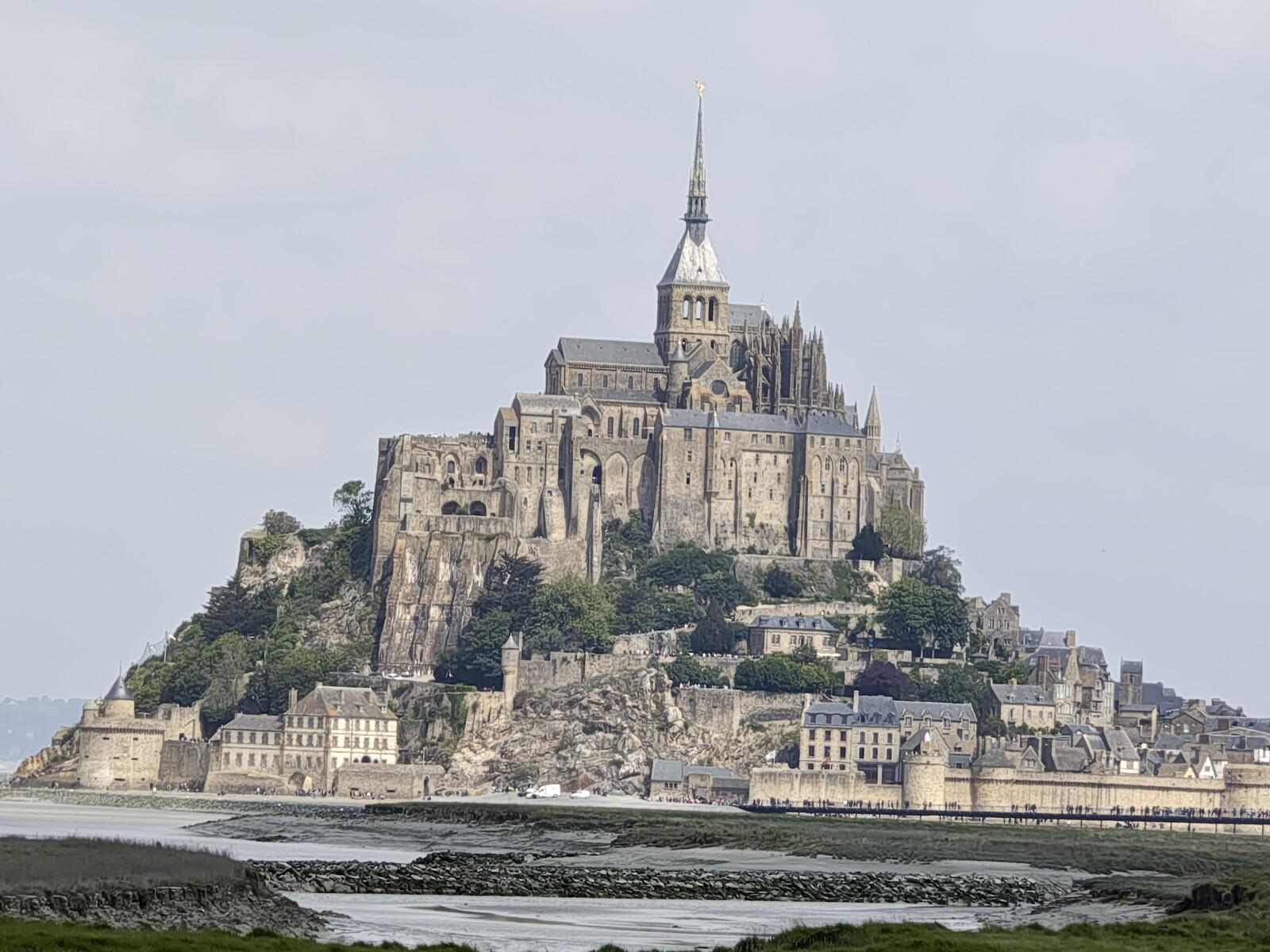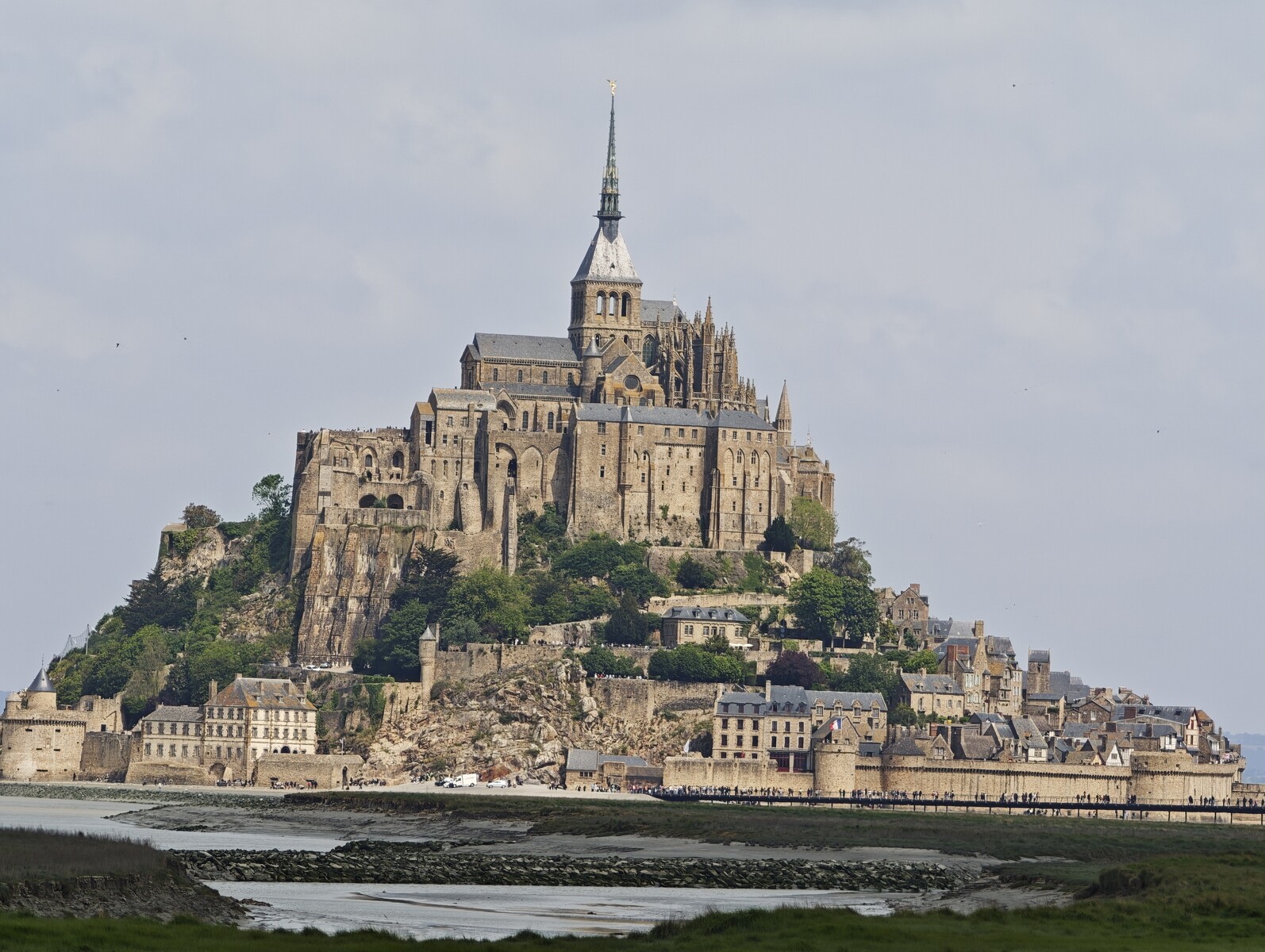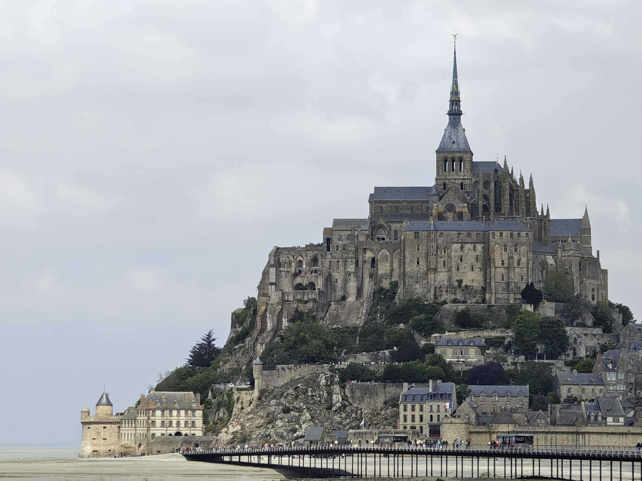 Nun, zunächst einmal ist da die spektakuläre Lage: Der mittelalterliche Ort liegt auf einem Felsen, etwa einen Kilometer vor der Küste der Normandie. Dieser befindet sich in einer Bucht mit einem Gezeitenunterschiede, welcher zu den größten der Welt gehört, sodass man bei Ebbe auch durch das Watt zum Berg gelangen kann – das sollte man allerdings nur mit einem erfahrenen Guide tun.