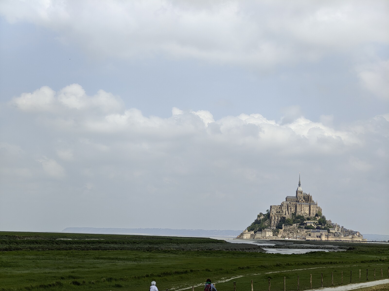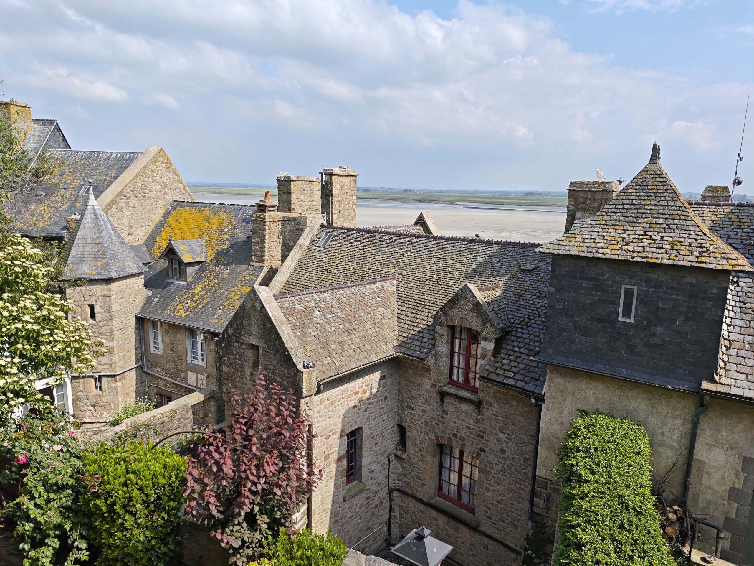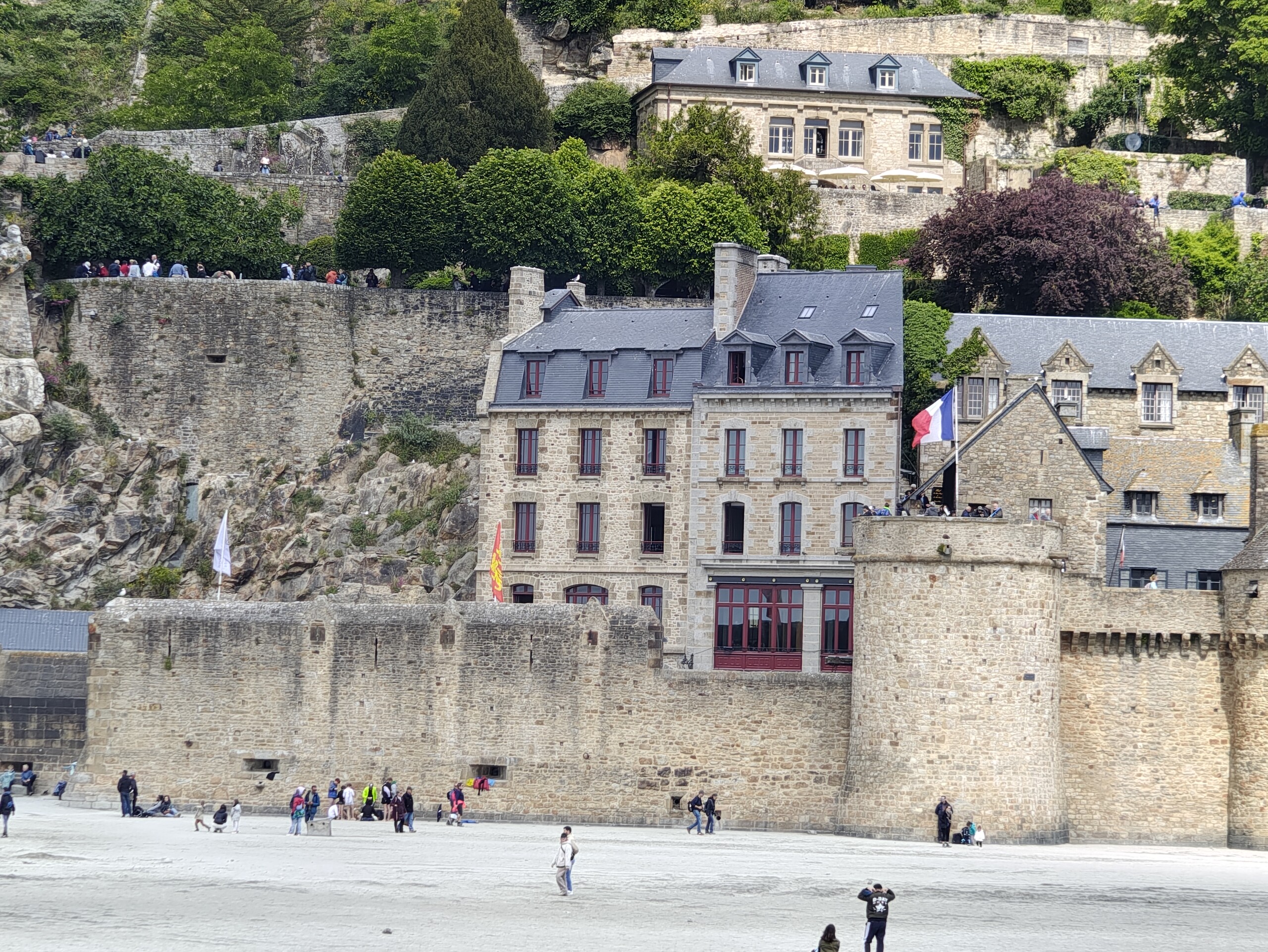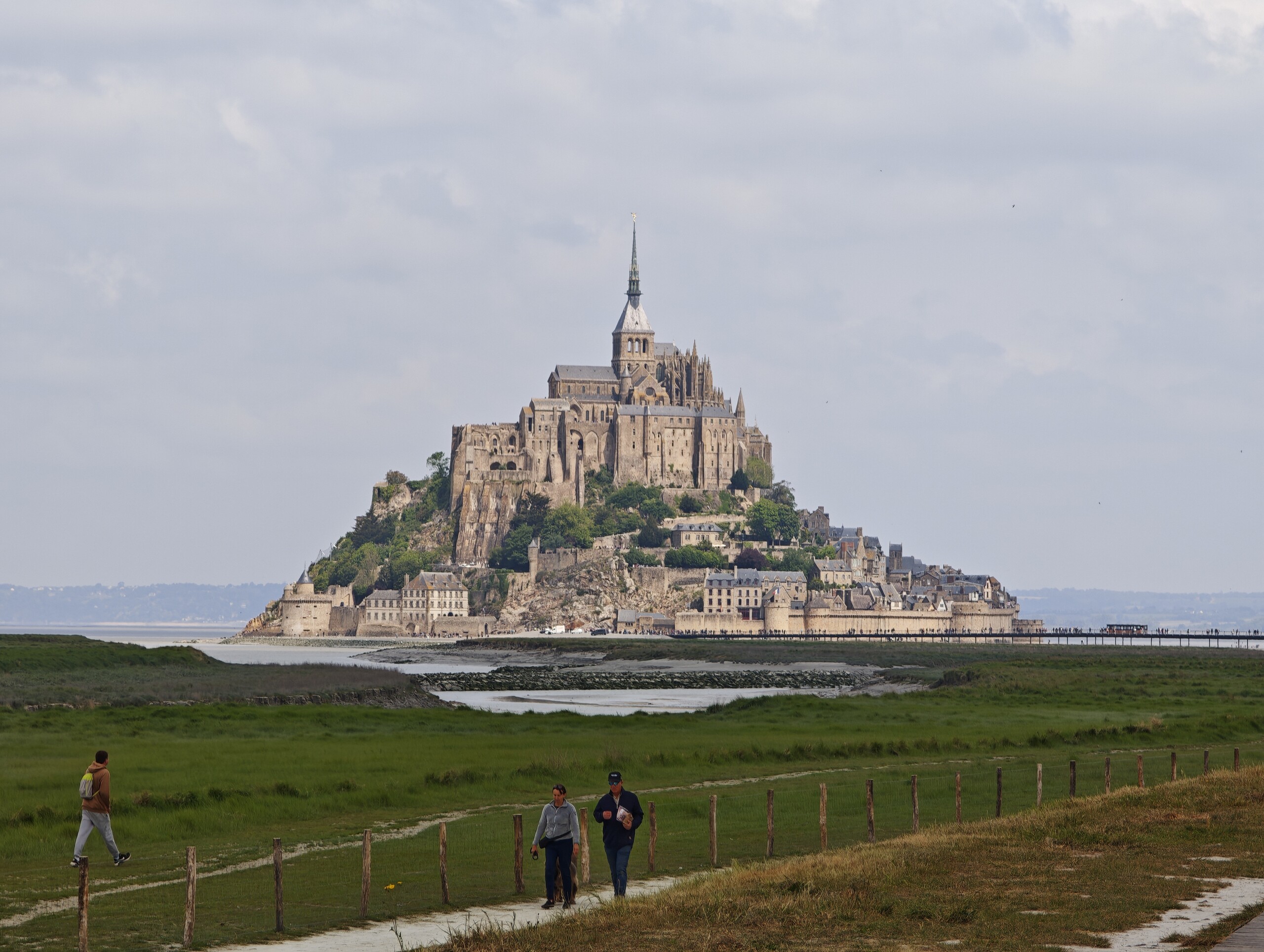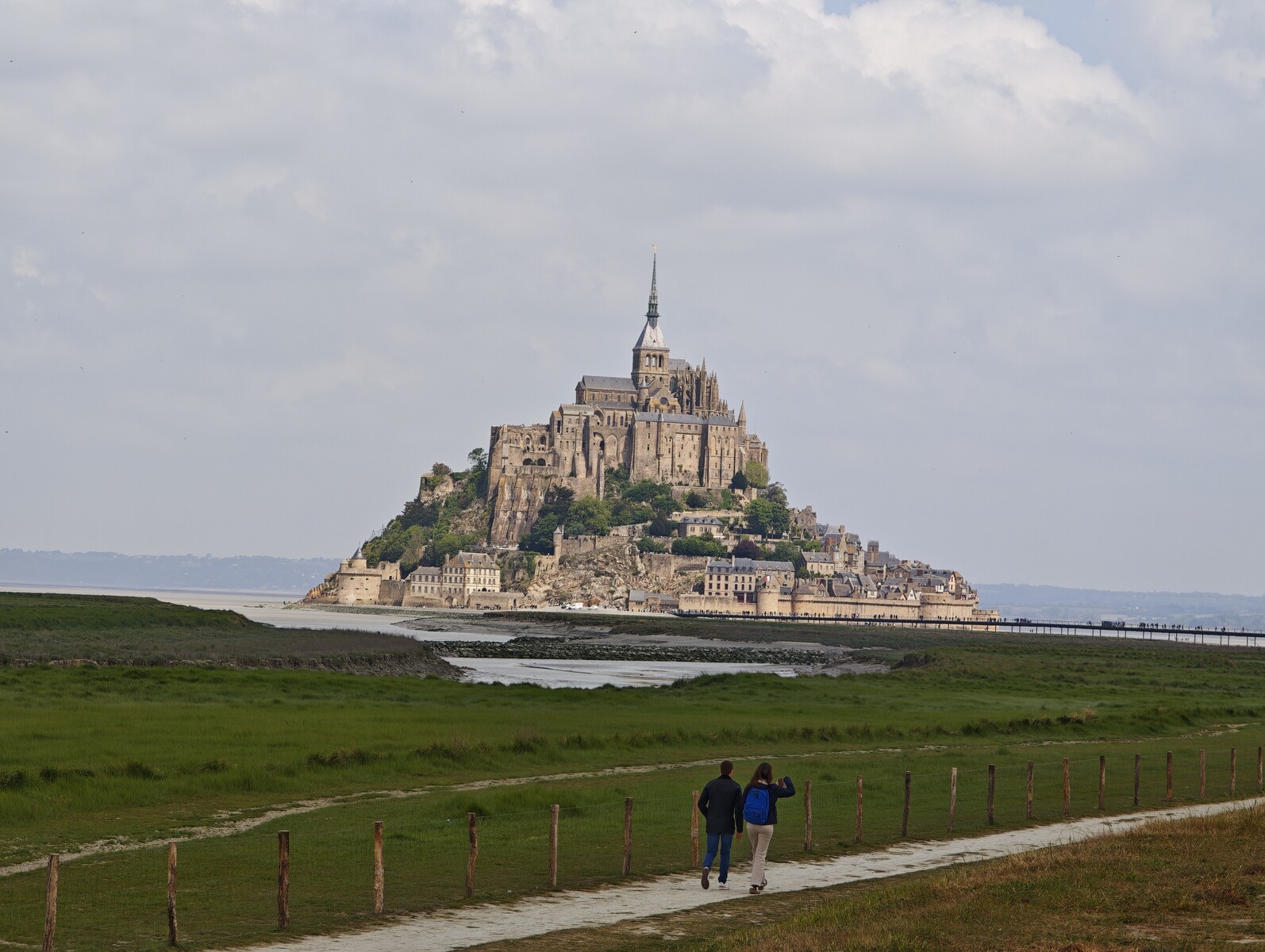 Nun, zunächst einmal ist da die spektakuläre Lage: Der mittelalterliche Ort liegt auf einem Felsen, etwa einen Kilometer vor der Küste der Normandie. Dieser befindet sich in einer Bucht mit einem Gezeitenunterschiede, welcher zu den größten der Welt gehört, sodass man bei Ebbe auch durch das Watt zum Berg gelangen kann – das sollte man allerdings nur mit einem erfahrenen Guide tun.