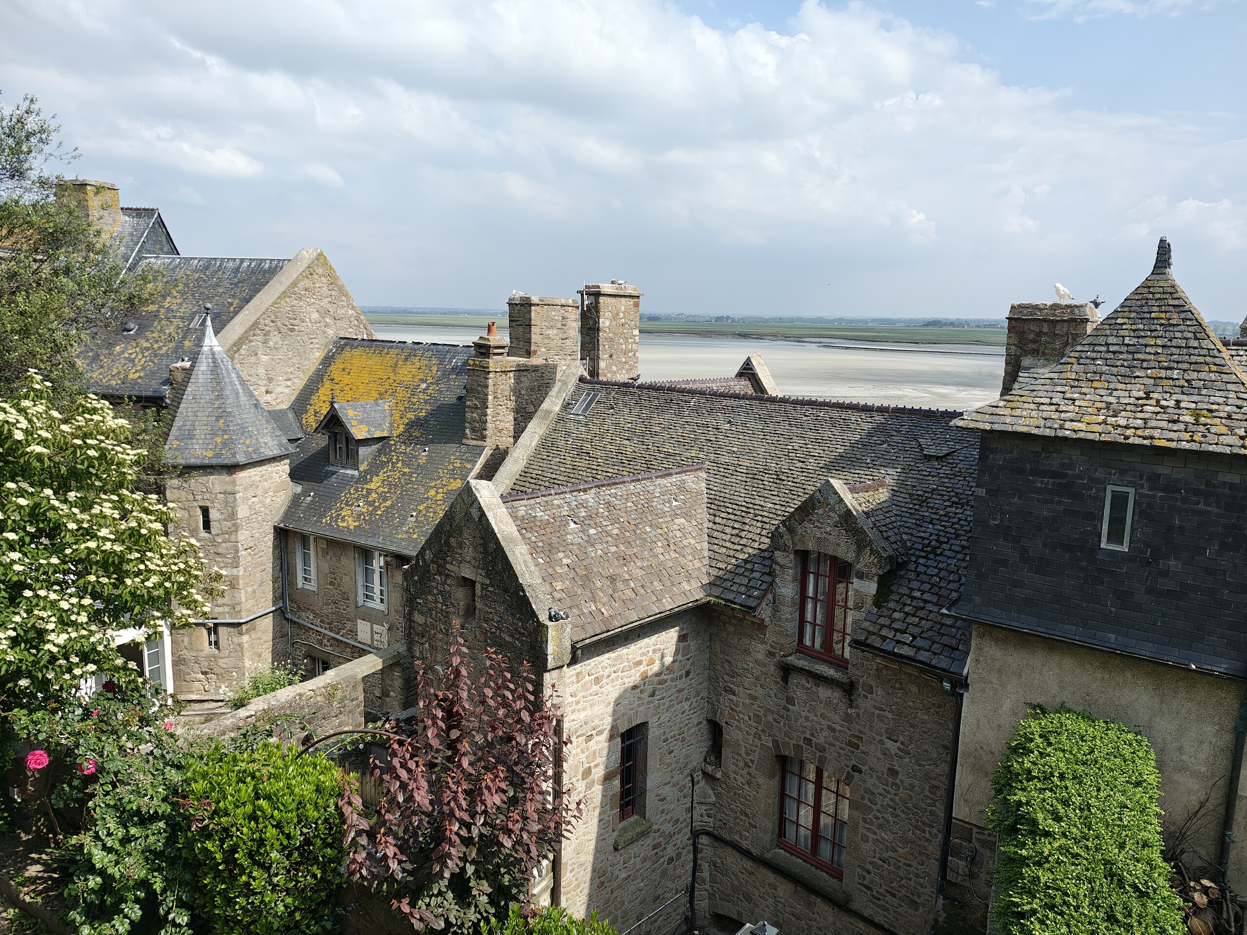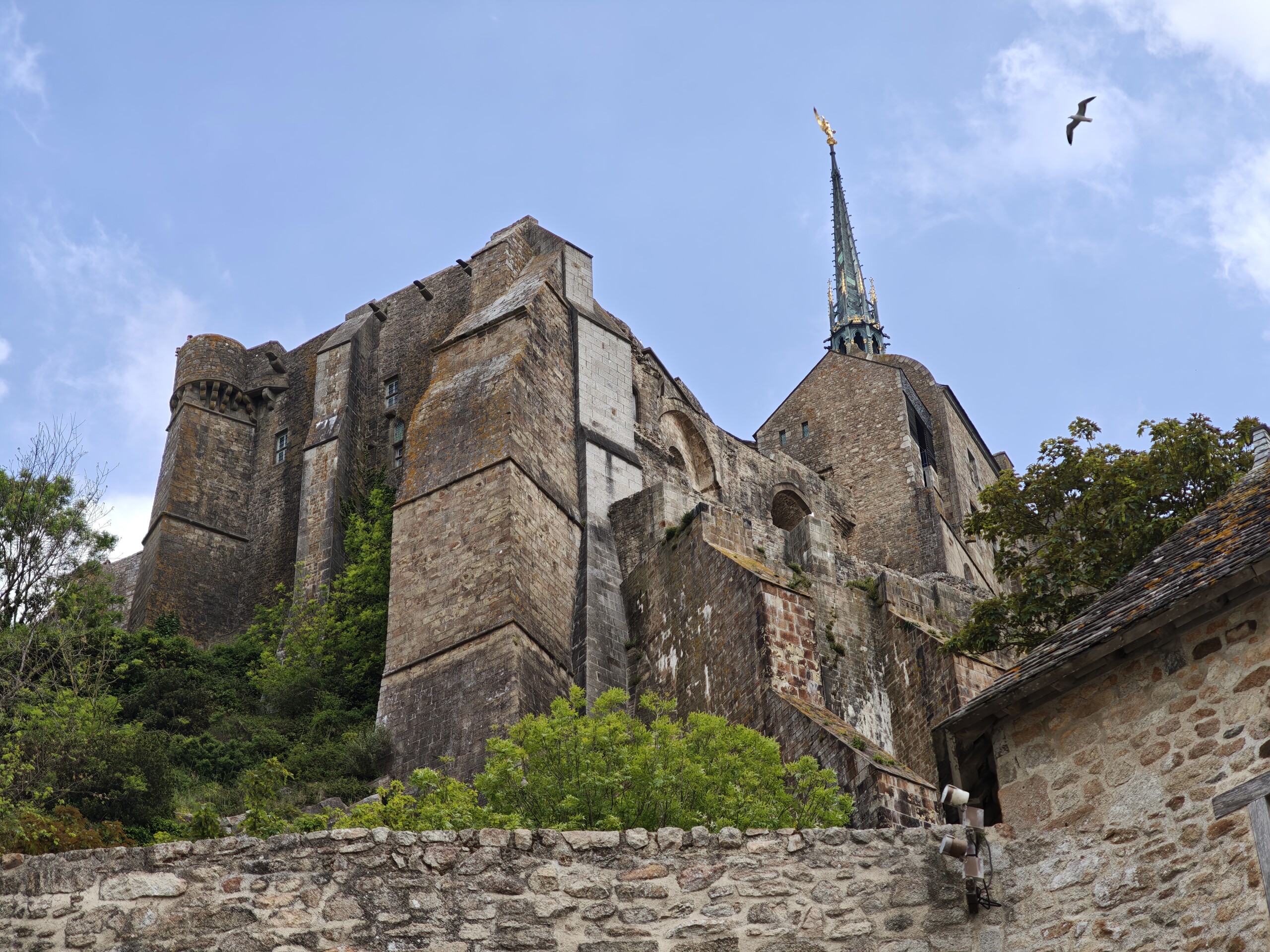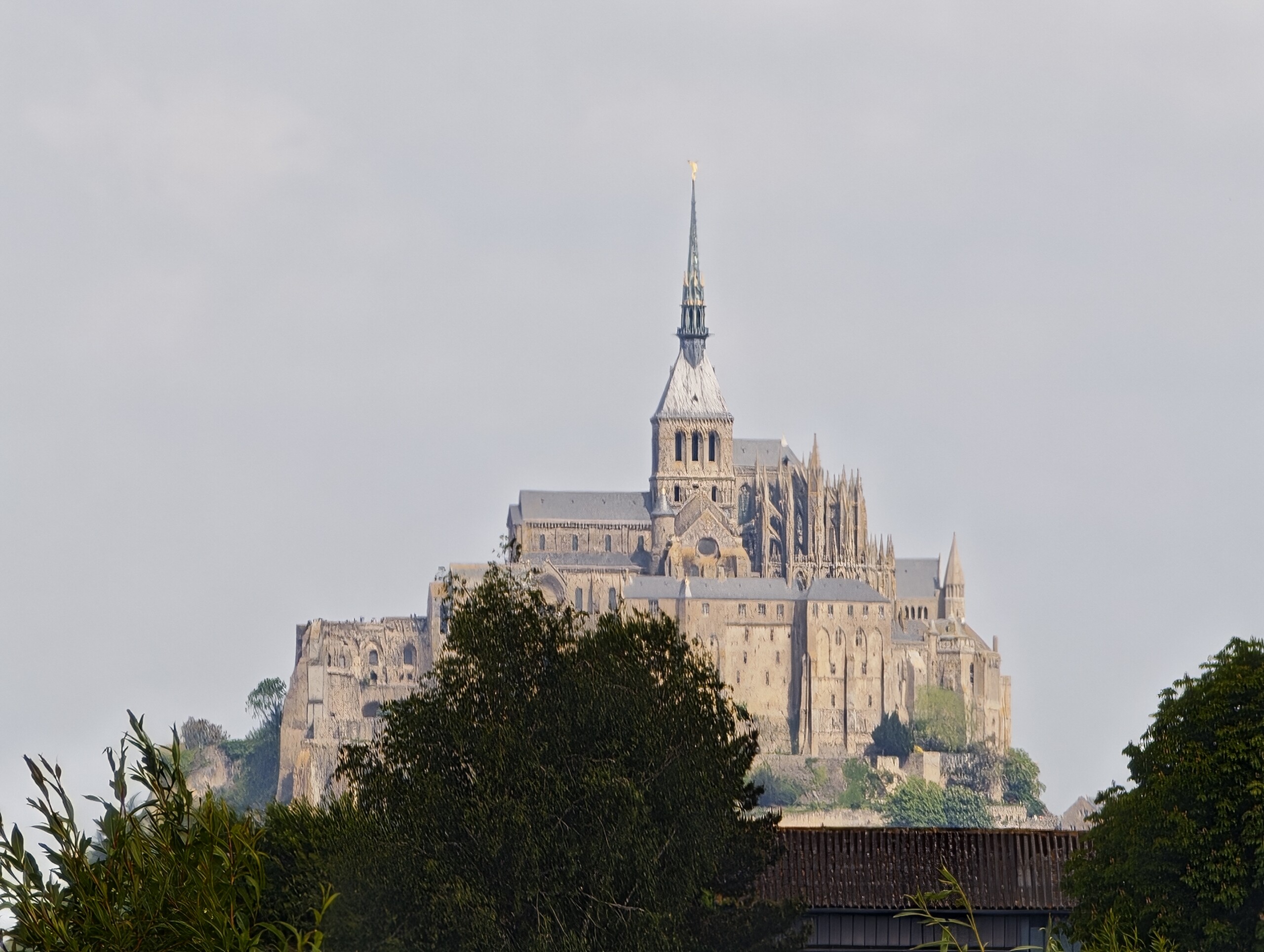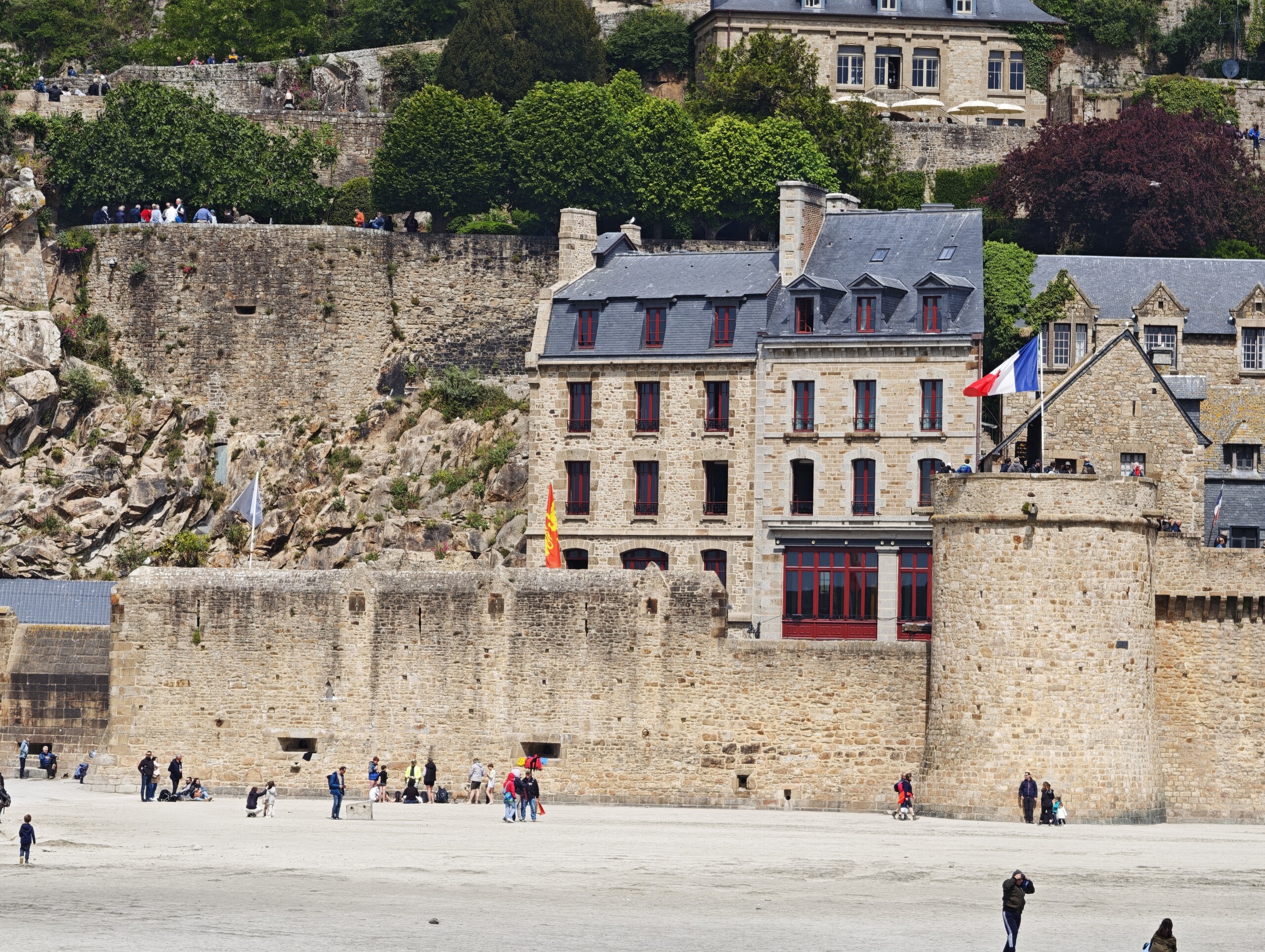 Nun, zunächst einmal ist da die spektakuläre Lage: Der mittelalterliche Ort liegt auf einem Felsen, etwa einen Kilometer vor der Küste der Normandie. Dieser befindet sich in einer Bucht mit einem Gezeitenunterschiede, welcher zu den größten der Welt gehört, sodass man bei Ebbe auch durch das Watt zum Berg gelangen kann – das sollte man allerdings nur mit einem erfahrenen Guide tun.