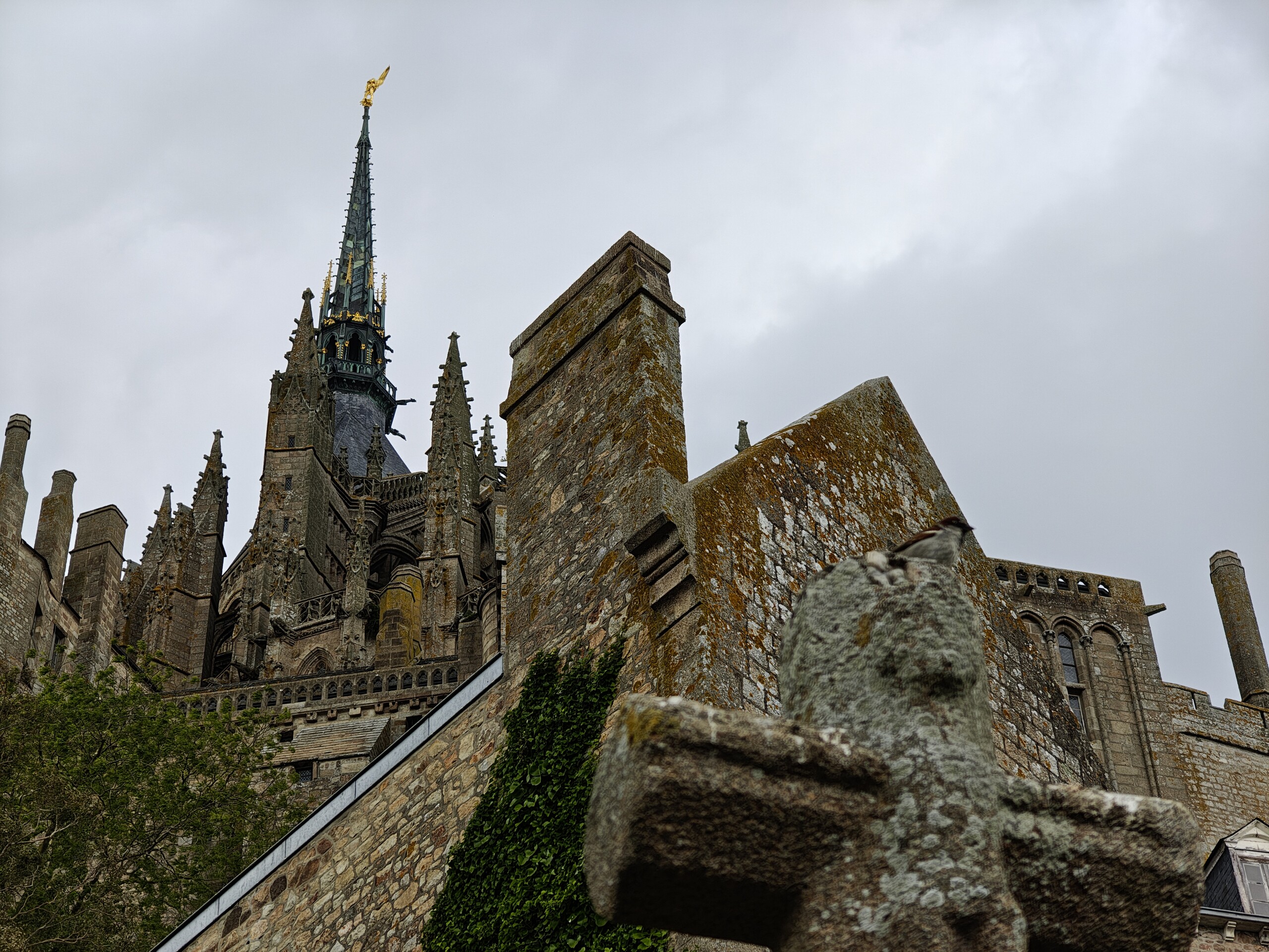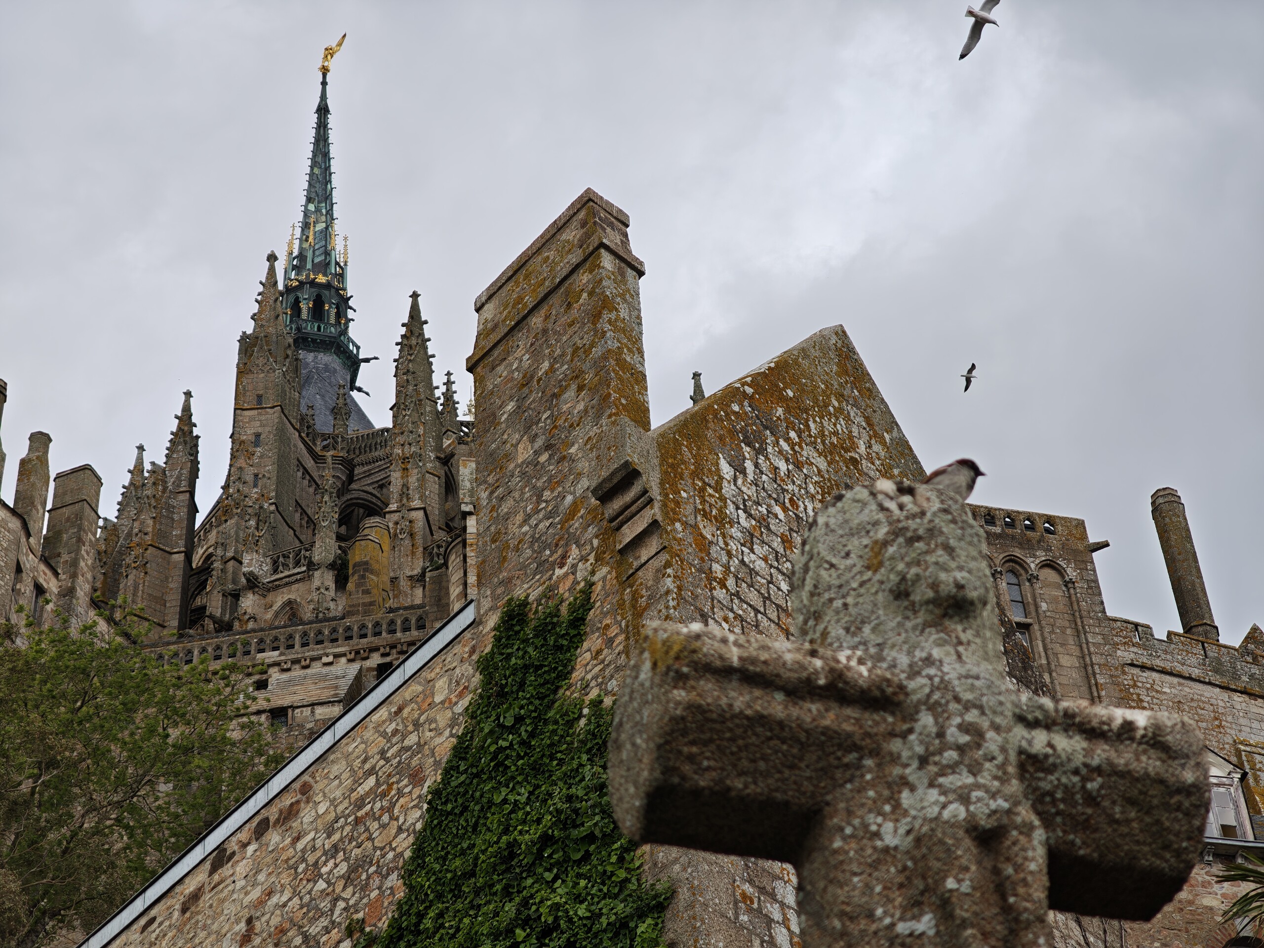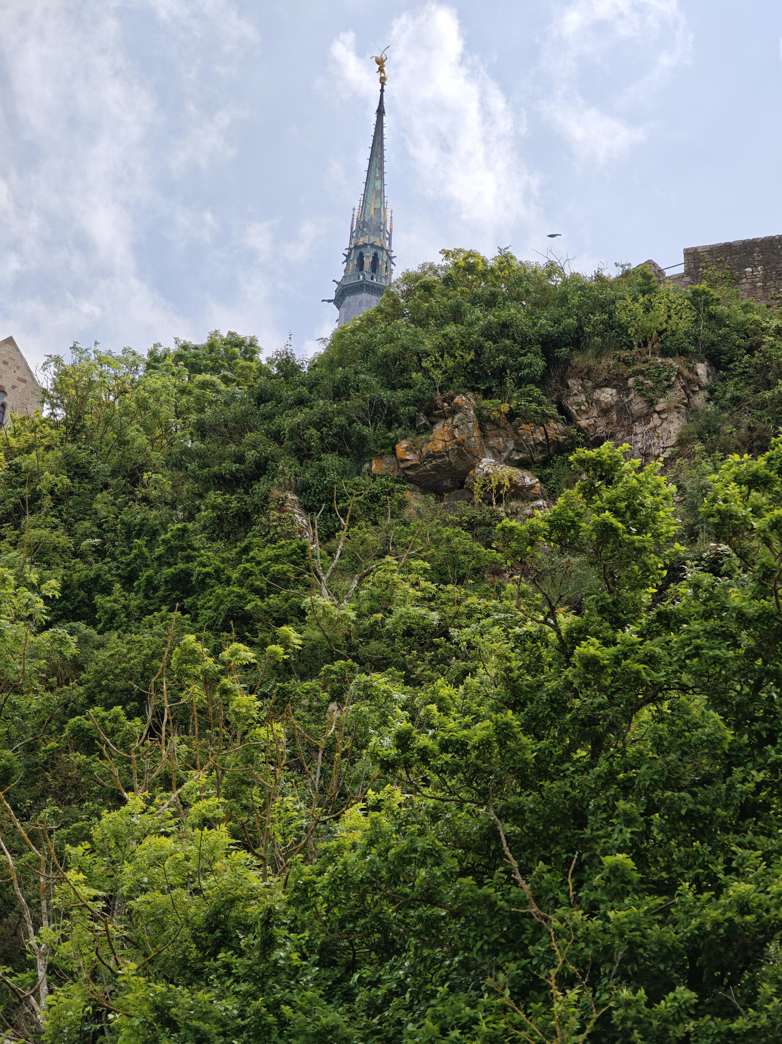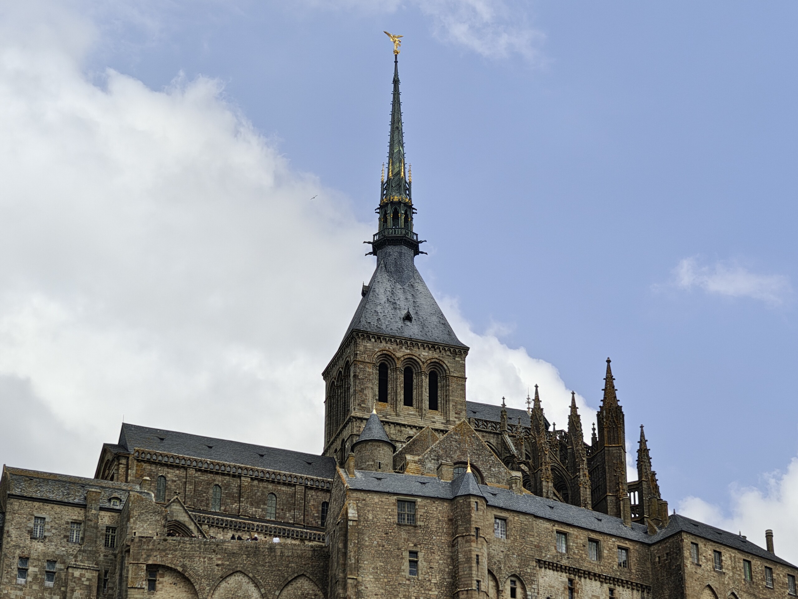 Am Mont-Saint-Michel angekommen strömen die Menschenmassen durch ein schmales Tor in den Ort. Da gerade Ebbe ist, entschließen wir uns stattdessen erstmal zu einem Rundgang um den Berg. Über uns wacht dabei die goldene Statue des Erzengels Michael, nach welchem der Berg auch benannt ist. Sie befindet sich auf dem höchsten Turm des Klosters und ist so gut wie immer sichtbar.