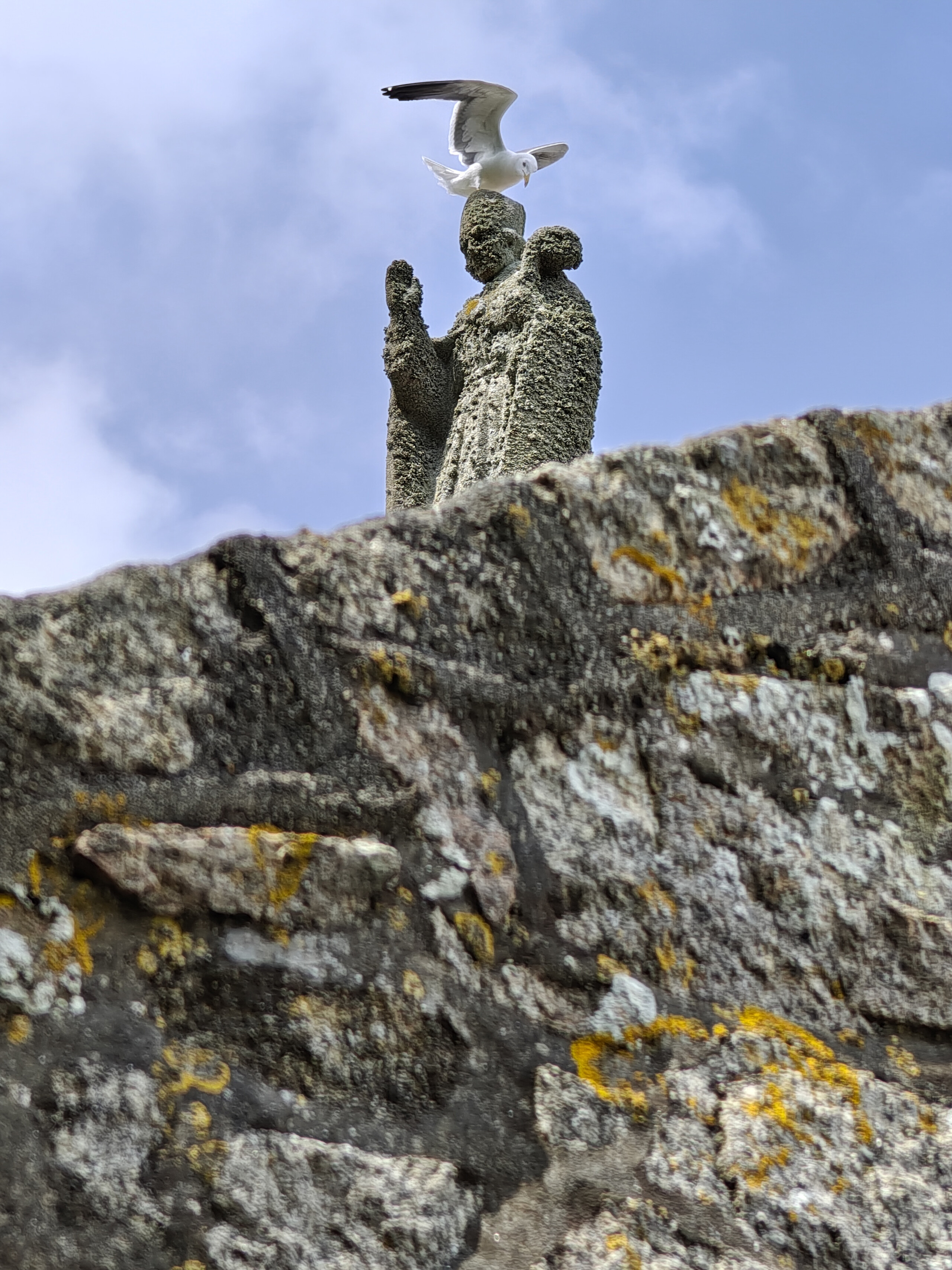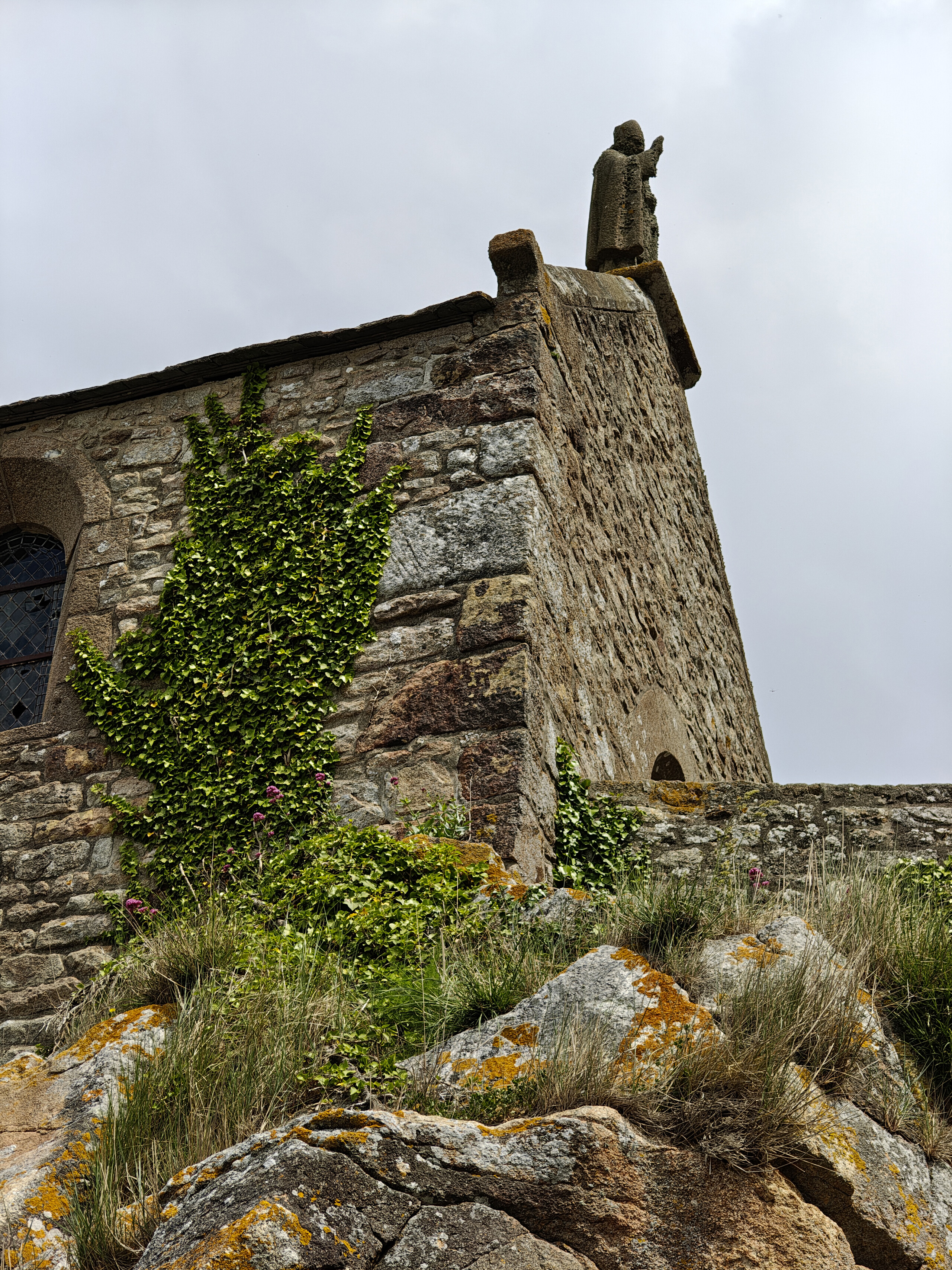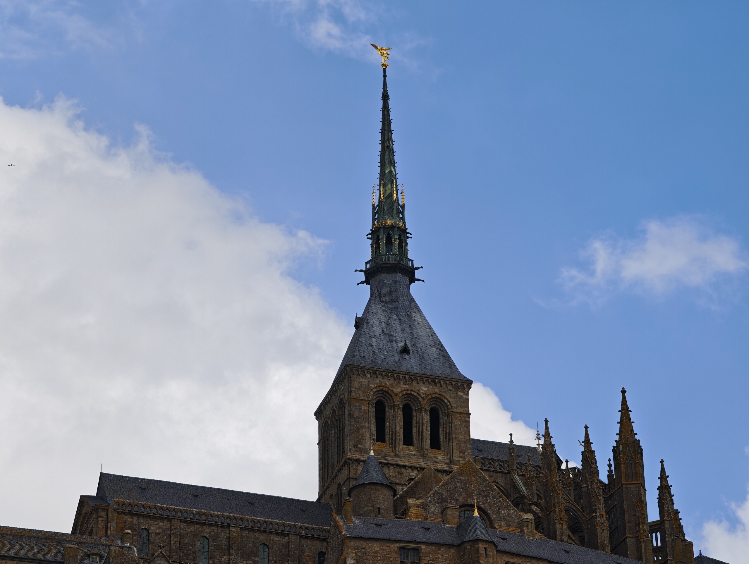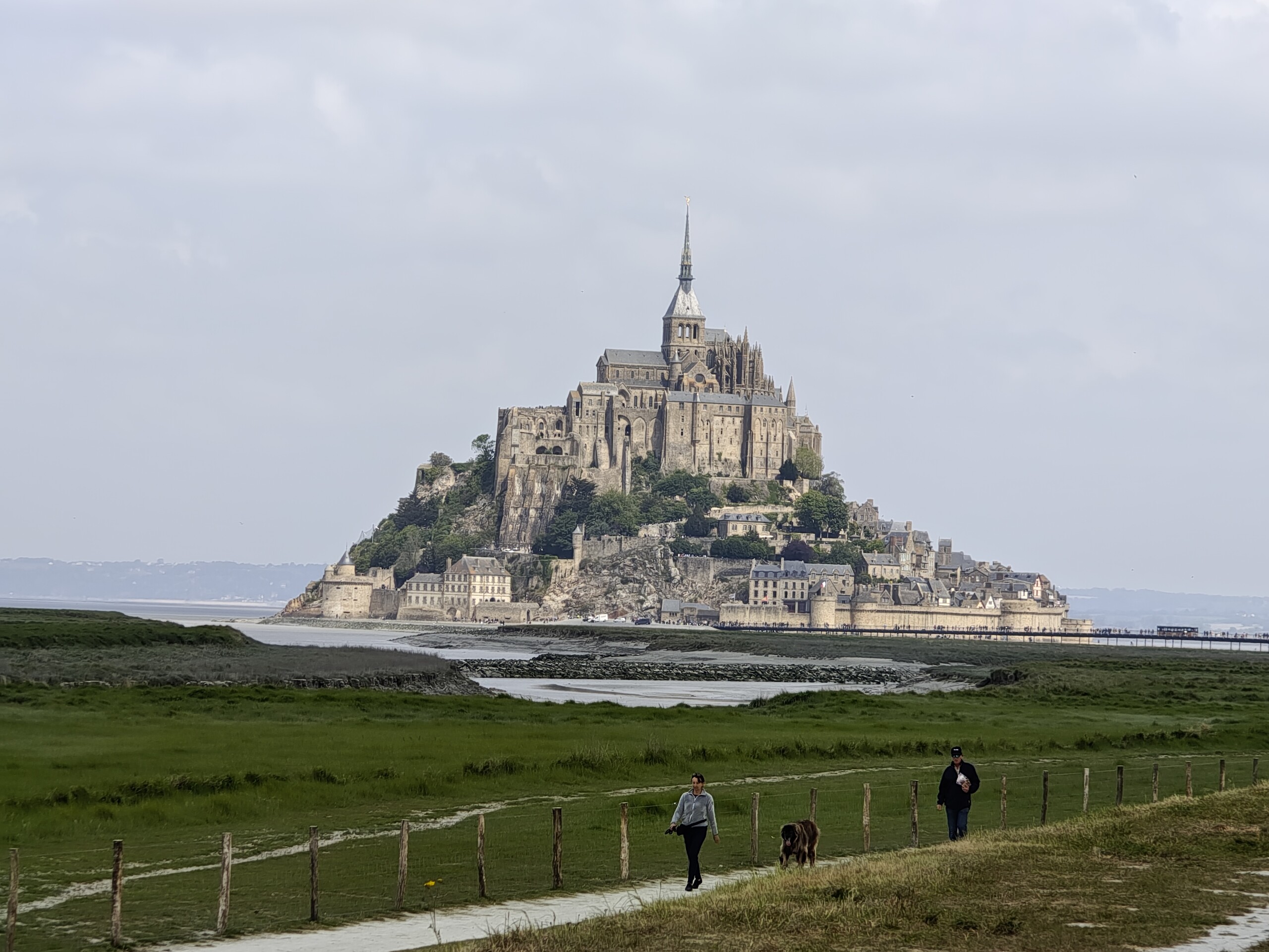 Am Mont-Saint-Michel angekommen strömen die Menschenmassen durch ein schmales Tor in den Ort. Da gerade Ebbe ist, entschließen wir uns stattdessen erstmal zu einem Rundgang um den Berg. Über uns wacht dabei die goldene Statue des Erzengels Michael, nach welchem der Berg auch benannt ist. Sie befindet sich auf dem höchsten Turm des Klosters und ist so gut wie immer sichtbar.
