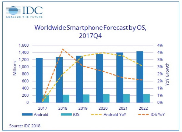 Weltweit wurden im Jahr 2017 insgesamt 1,46 Milliarden Smartphones ausgeliefert. Fast alle abgesetzten Smartphones hatten im vergangenen Jahr entweder Google Android oder Apple iOS als Mobile-OS an Bord. Alle anderen OS-Plattformen spielen volumentechnisch längst keinerlei Rolle mehr. Für die Zukunft geht IDC davon aus, dass das Liefervolumen sich auf einem niedrigen einstelligen Wachstum einpendeln wird.