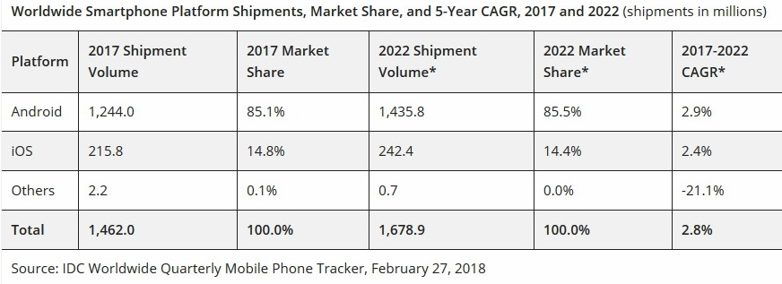 Für den Smartphone-Gesamtmarkt im Zeitraum 2017 bis 2022 erwarten die Marktbeobachter eine durchschnittliche jährliche Wachstumsrate (CAGR) von 2,8 Prozent, mit einem prognostizierten Absatz- und Liefervolumen von 1,68 Milliarden Smartphones bis 2022. Dass der Absatz von Smartphones irgendwann seinen Höhepunkt überschreiten wird, war klar, so IDC. Vor allem das Absatzminus (-5,0 %) für Smartphones in China und EMEA (-3,5 %) habe in der Endabrechnung 2017 durchgeschlagen.