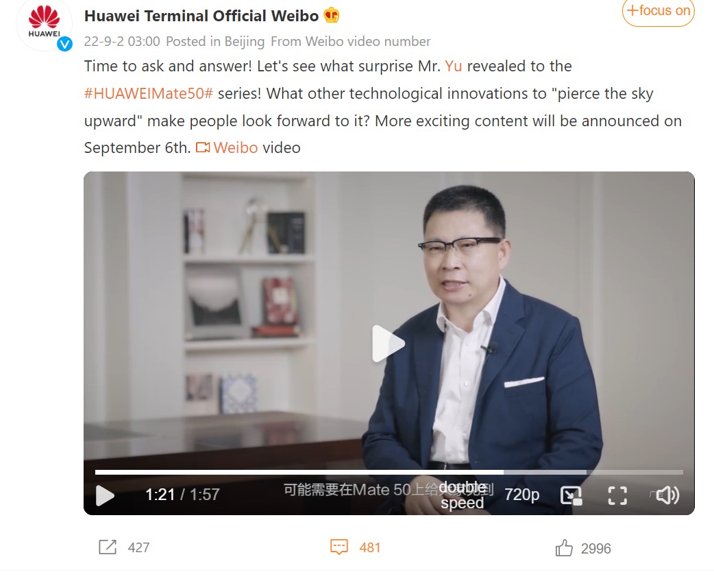 Noch nicht offiziell aber durchaus schon unmissverständlich angeteasert, äußerte sich Huawei Mobile CEO Richard Yu im chinesischen Netzwerk Weibo zu drei neuen Technologien im nahenden Huawei Mate 50. Im Video-Interview spricht er konkret das XIMAGE-System für die Kamera der Mate 50-Serie sowie HarmonyOS 3 an. Mit den Worten "pierce the sky upward" ist dann vermutlich die Satellitenkommunikation für Notrufe gemeint. Besonders auffällig: Huawei hat den Mate 50 Launch in China exakt einen Tag vor Apples iPhone 14 Event am 6. September angesetzt, vermutlich um Apple beim Thema Satelliten-Anbindung zuvorzukommen.