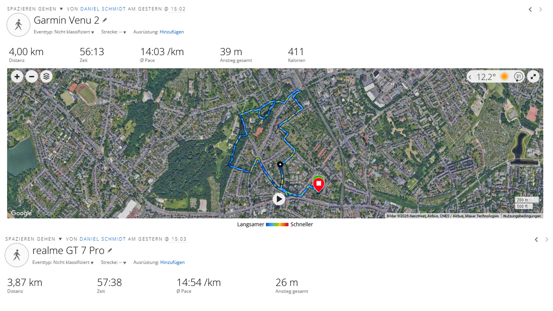 Die Positionsbestimmung des Realme-Phones überzeugt im Vergleich zu unserem Referenzgerät (Garmin Venu 2) mit exakten Ergebnisse, obwohl kleinere Ungenauigkeiten in der Streckenaufzeichnung vorhanden sind. Auch dank Dual-Band-GNSS können wir mit dem GT7 Pro nur geringfügige Abweichungen zu dem tatsächlich benutzten Weg feststellen.