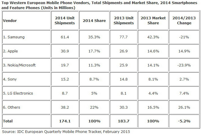 Bei den Top 5 der weltweit größten Hersteller konnte Samsung im Jahr 2014 deutlich weniger Mobiltelefone verkaufen als im Jahr zuvor. Das Liefervolumen der Nummer 1 bei den Handys sank von 77,7 Millionen Einheiten im Jahr 2013, auf 64,4 Mio. im Jahr 2014. Der Marktanteil von Samsung rutschte auf 35,3 Prozent (2013: 42,3 %) ab. Im Marktsegment Smartphones weist IDC für Samsung ebenfalls ein deutliches Minus (siehe Bilderstrecke unten) aus. Während Microsoft und LG in Westeuropa zweistellig zulegen konnten, musste sich Sony mit plus 2,7 Prozent zufrieden geben.