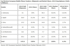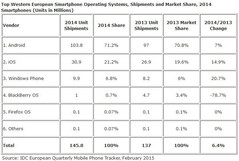Die International Data Corporation (IDC) hat die Zahlen zur abschließenden Bewertung für den Smartphone-Markt im Jahr 2014 in Westeuropa veröffentlicht. Demnach stieg das Absatzvolumen für Smartphones um 6,4 Prozent von 137 auf 145,8 Millionen Einheiten. Gleichzeitig ist das Gesamtvolumen für Mobiltelefone inklusive Feature Phones mit einem Minus von 5,2 Prozent von 183,7 auf 174,1 Millionen Geräte gesunken.