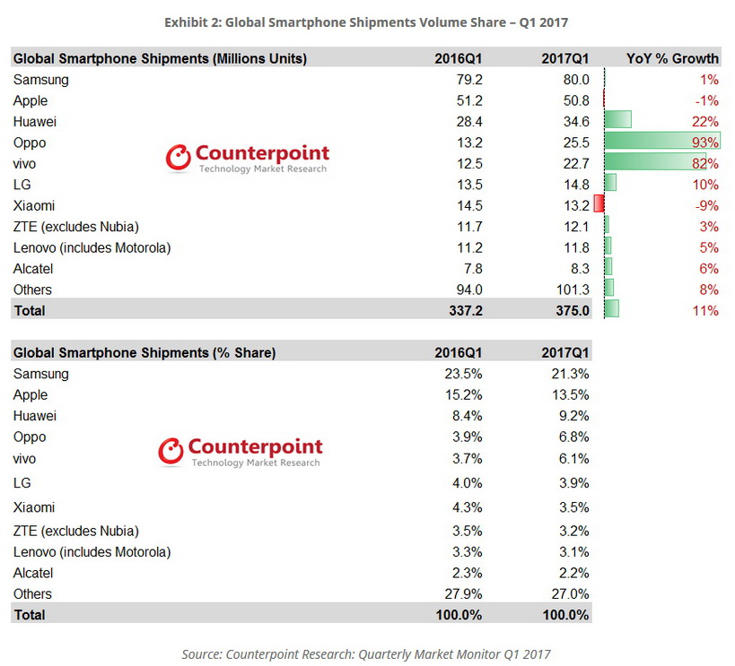 Die Analysten von Counterpoint Research haben ihre Ergebnisse für die Entwicklung auf dem Smartphone-Markt für das erste Quartal 2017 (Q1/2017) auf den Tisch gelegt. Demnach wuchs das globale Absatz- und Liefervolumen für Smartphones in Q1/2017 von 337,2 Millionen Geräten im 1. Quartal 2016 auf jetzt 375 Millionen Einheiten. Das Wachstum findet derzeit allerdings nur in wenigen Ländern und Regionen statt, so die Analysten. Dazu zählen beispielsweise Afrika, Indien, der Mittlere Osten, kleinere Regionen in Asien sowie Europa.