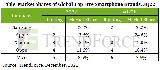 In Q4/2022 wird sich gemäß der Prognose von TrenForce wieder Apple vor Samsung bei den Marktanteilen schieben können und im Schlussquartal wieder auf Platz 1 vor den Koreanern stehe, Xiaomi, Oppo und Vivo folgen auf den Plätzen drei, vier und fünf. Xiaomi und seine Untermarken Redmi, Poco und Black Shark, Oppo mit Realme und OnePlus sowie Vivo mit iQoo bleiben wegen der Verlangsamung des indischen Wirtschaftswachstums weiter unter Druck. TrendForce sieht für Xiaomi, Oppo und Vivo vor großen Herausforderungen. China als Heimat- und Hauptmarkt sei bereits stark gesättigt.