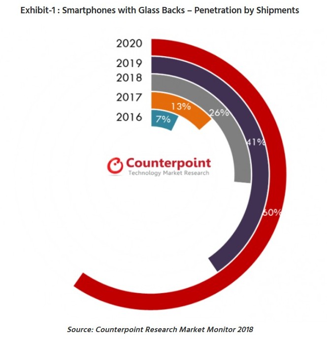 Bis Ende 2020 sollen voraussichtlich 60 Prozent aller dann weltweit ausgelieferten Smartphones ein Backcover aus Glas besitzen. Im Premium-Segment wird Glas an der Geräterückseite künftig sogar bei rund 80 % aller Flaggschiff-Modelle der Smartphone-Hersteller zum Einsatz kommen, so die Analysten. Laut Counterpoint verwendete Apple bei rund 64 % seines Portfolios Glas als Backcover-Material. Damit liegt Apple im Vergleich zur Konkurrenz an der Spitze. Vor allem das iPhone 8 und das iPhone X pushten diesen Vorsprung. Samsung lieferte rund 36 % seiner Smartphone-Gesamtlieferungen mit Glasrückseite aus.