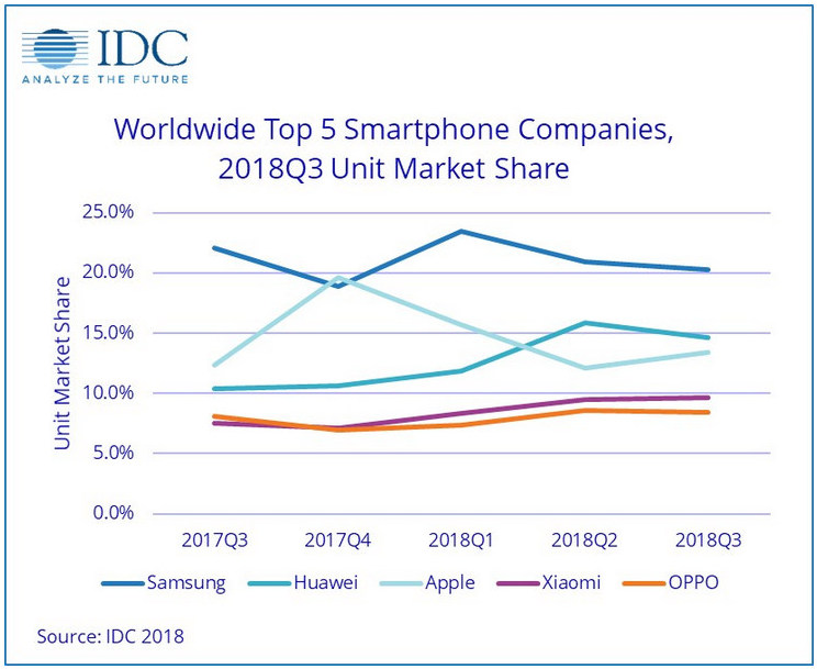 Laut Strategy Analytics lieferte Samsung in Q3/2018 weltweit 72,3 Millionen Mobiltelefone aus. Das sind rund 13,3 Prozent weniger als im Vorjahresquartal (83,4 Mio.). Der Marktanteil sank auf 20,1 %. Ähnlich bewertet Counterpoint Research die Marktsituation. 72,3 Mio. Samsung-Handys in Q3/2018 stehen 83,3 Mio. aus dem Vorjahr gegenüber: minus 13 %, Marktanteil 19 %. Als dritte Marktanalysten im Bunde nennen die Branchenexperten von IDC für Samsung einen Rückgang beim Absatzvolumen in Höhe von -13,4 % auf 72,2 Mio. Einheiten. Samsungs Marktanteil schrumpfte in der IDC-Analyse auf 20,3 % (Q3/2017: 22,1 %).