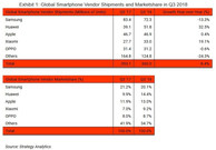 Die stärksten Konkurrenten von Samsung sind derzeit Huawei mit seinem Direktlabel Honor und Xiaomi. Apple kann sich inmitten der Südkoreaner und Chinesen noch gut behaupten, allerdings verzeichnen die drei Marktforschungsunternehmen für das Top-Duo aus China enorme Zuwächse. Bei Counterpoint kommen Huawei und Xiaomi auf 33 % respektive 25 % Wachstum, bei IDC auf 32,9 % und 21,2 %. Strategy Analytics bewertet das Wachstum von Huawei (32,5 %) ähnlich. Xiaomi kommt hier mit 19,1 % etwas schlechter weg.