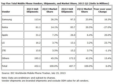 IDC hat seinen Bericht Q2/2013 für den Markt der Mobiltelefone und das Marktsegment der Smartphones veröffentlicht. Im Ranking der Top 5 der weltweit größten Smartphone-Hersteller dominieren nach wie vor Samsung und Apple auf den Plätzen 1 und 2. Samsung lieferte im Vergleich zum Vorjahr (50,3 Mio.) im 2. Quartal 2013 mit 72,4 Millionen Smartphones um fast 44 Prozent mehr Phones aus. Apple steigerte das Liefervolumen seines iPhone von 26 auf 31,2 Millionen (+20 %).
