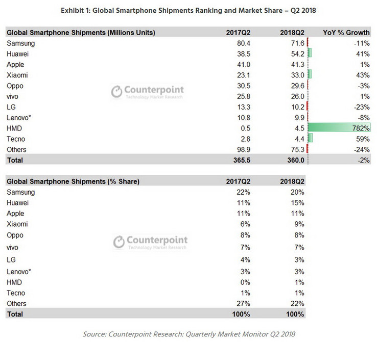 Huawei hat es geschafft, im zweiten Quartal 2018 mehr Smartphones abzusetzen als Apple iPhones. Damit ist Huawei jetzt hinter Samsung zum zweitgrößten Smartphone-Hersteller der Welt aufgestiegen. Dank dieser Sensation über den Huawei-Erfolg ist die Performance einiger anderer Anbieter und Marken in den Schlagzeilen der Weltpresse etwas untergegangen. Doch es lohnt sich auch die Plätze sechs bis zehn in den Top 10 anzusehen.
