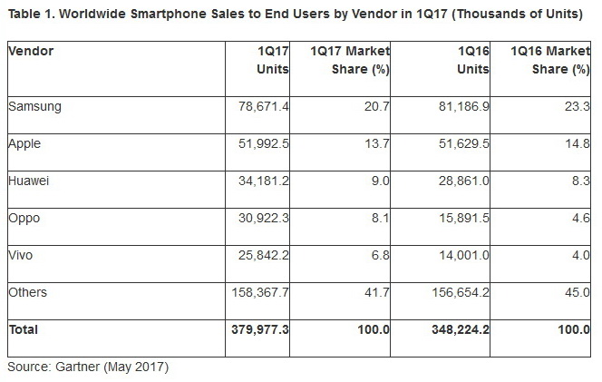Nach den Marktzahlen von Counterpoint Research hat auch Gartner seine Zahlen für den globalen Smartphone-Markt im ersten Quartal 2017 bekannt gegeben. Gartner taxiert das weltweite Absatz- und Liefervolumen für Smartphones in Q1/2017 auf fast 380 Millionen Geräte. Ein Plus von 9,1 Prozent. Im 1. Quartal 2016 waren es noch unter 350 Millionen. Gemäß der Analyse von Gartner haben die Verbraucher, im Vergleich zu vorherigen Quartalen, mehr Geld für ein neues Smartphone ausgegeben.