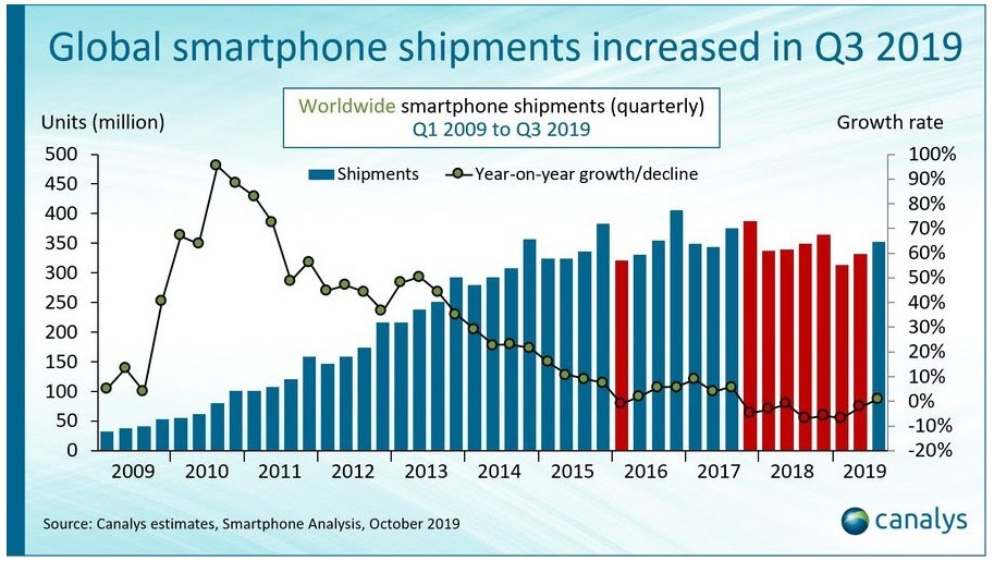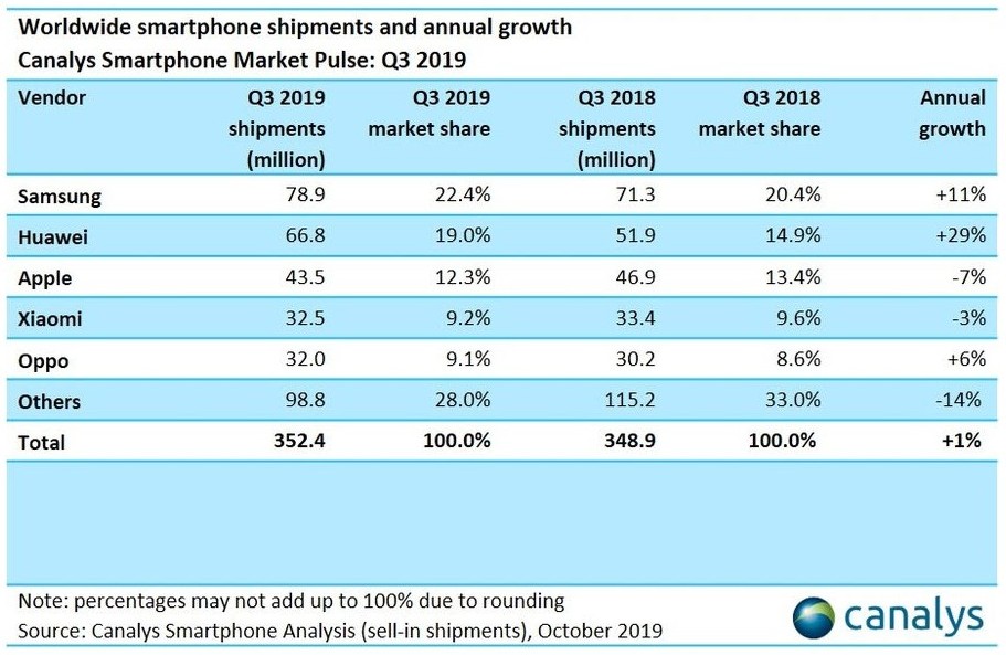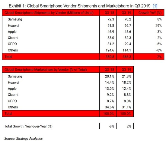 Von allen Smartphone-Herstellern, die im Top 5-Ranking der weltweit größten Handyhersteller verzeichnet sind, hat Huawei im 3. Quartal 2019 das größte Wachstum hingelegt. Canalys und IHS Markit verzeichnen für Huawei in Q3/2019 einen globalen Absatz von 66,8 Mio. Handys und damit ein Wachstum von +29 Prozent respektive +28 %. Die Schätzung von Strategy Analytics weist für Huawei 66,7 Mio. und ebenfalls ein Plus von 29 % aus. Keine Frage: der Huawei-Angriff auf Samsung läuft.