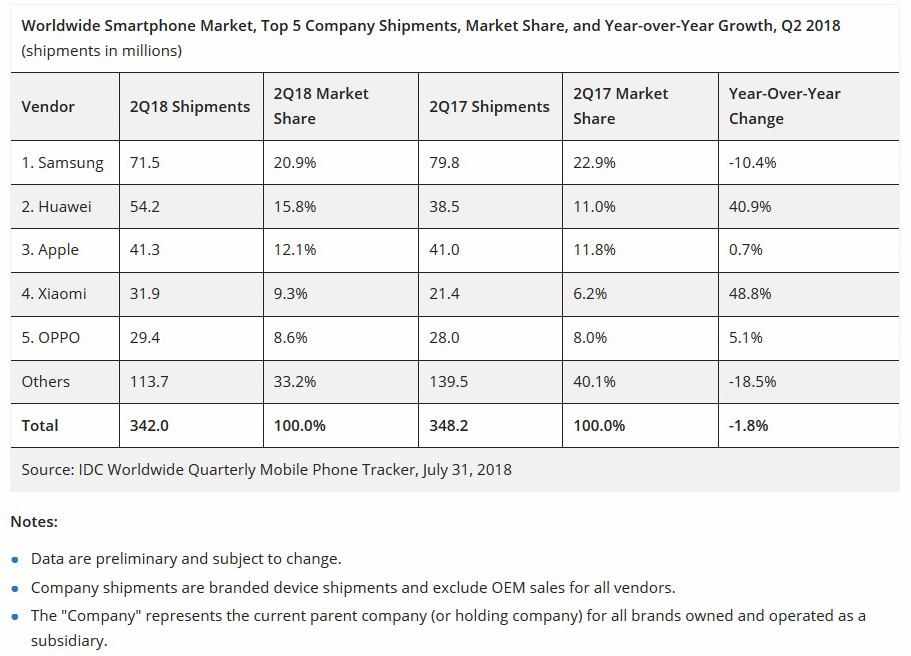 Samsung schaffte es laut IDC im zweiten Quartal 2018 71,5 Mio. Smartphones ausliefern, Canalys kommt auf insgesamt 73 Mio. Samsung-Smartphones. Der iPhone-Absatz von Apple blieb in etwa auf Vorjahresquartalniveau: 41,3 Mio. iPhones bei IDC, Canalys errechnete für Apple eine Stückzahl von rund 41 Mio. Das deutlichste Wachstum aller Smartphone-Hersteller in der Top 5 konnte allerdings Xiaomi verbuchen. Xiaomi steigerte sein Absatzvolumen von 21,4 auf 31,9 Mio. Geräte.
