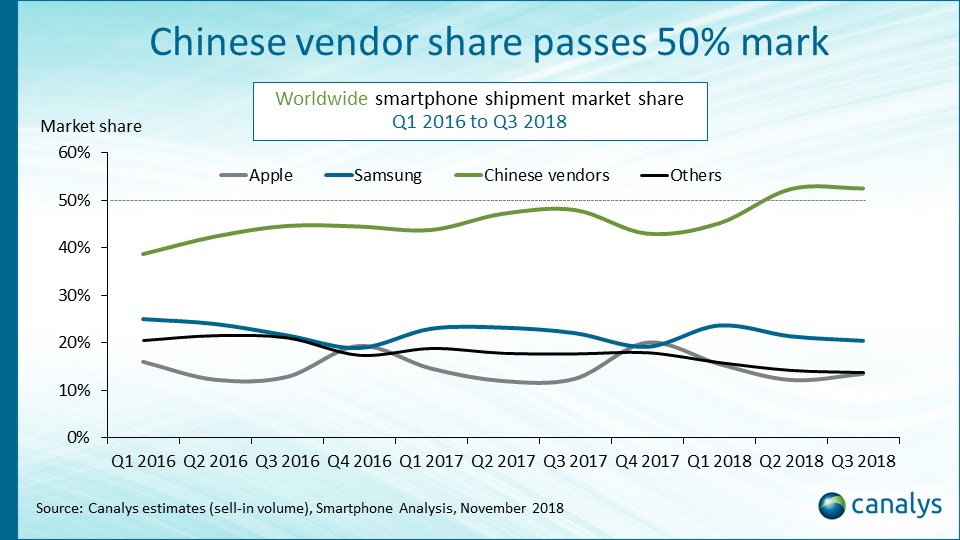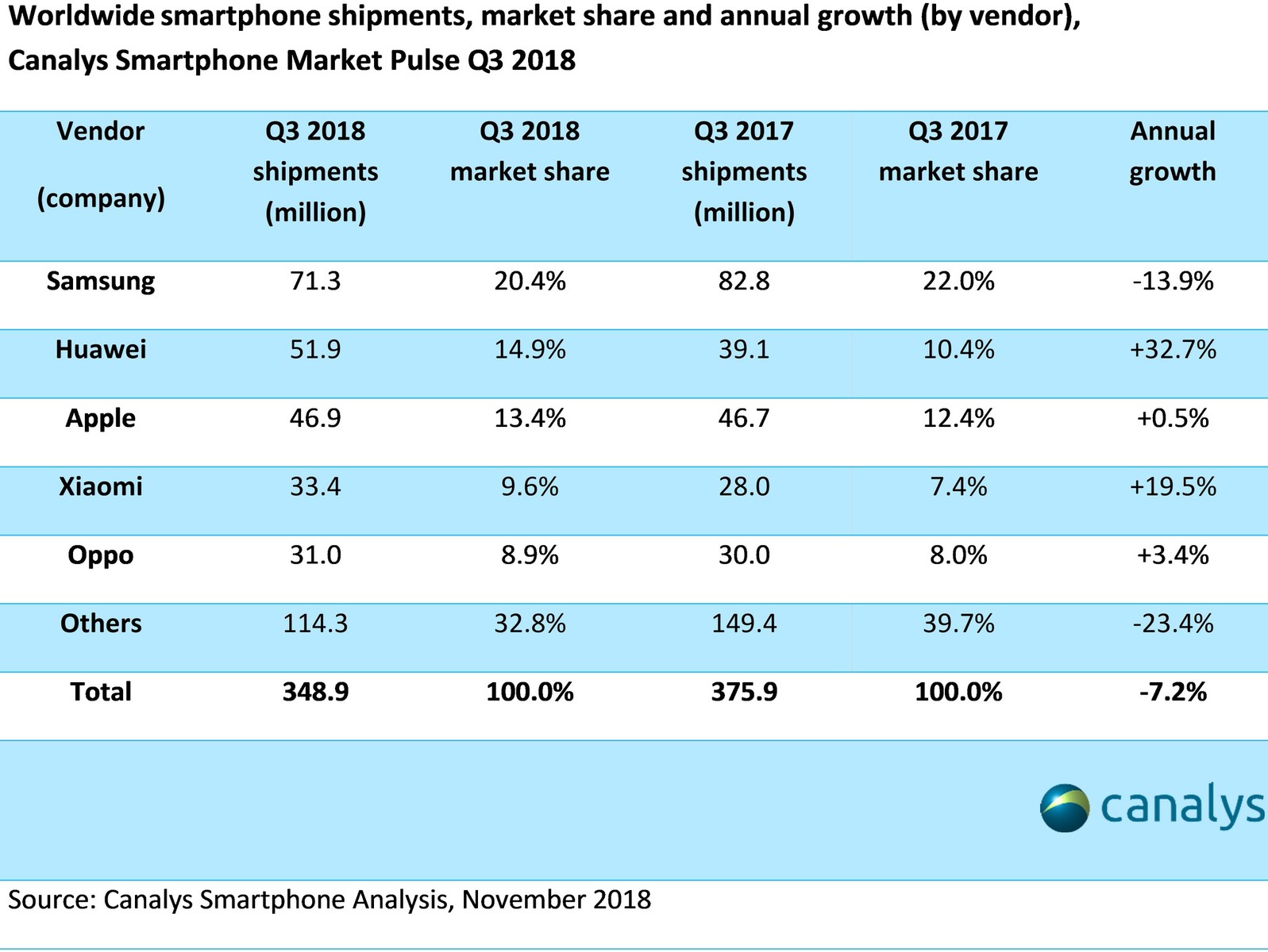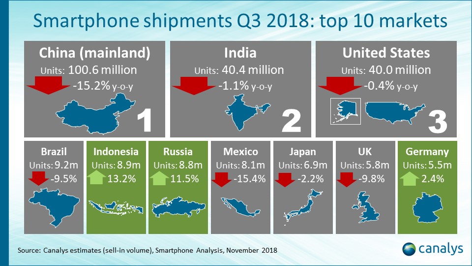 Vor allem Chinas Smartphone-Markt verzeichnete ein weiteres enttäuschendes Quartal: In Q3/2018 wurden nur 100,6 Millionen Mobiltelefone ausgeliefert. Dies stellt einen Rückgang von 15,2 % gegenüber dem Vorjahr und sequenziell ein Minus von 2,9 % dar. Indien überholte zwar die USA in diesem Quartal als zweitgrößten Markt, allerdings waren beide Länder im Vergleich zum Vorjahr von einer schwächeren saisonalen Entwicklung betroffen. In sieben der globalen Top-10-Märkte war im Jahresvergleich ein Rückgang der Absatzzahlen zu verzeichnen. Als Hauptgründe hierfür nennt Canalys längere Smartphone-Ersatzzyklen und die Verschlechterung der internationalen Handelsbedingungen.