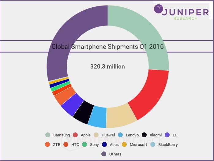 Die Quartalszahlen der Branchenriesen Apple und Samsung spiegeln sich auch im aktuellen Marktbericht der Analysten von Juniper Research wider. Juniper Research berichtet, dass das weltweite Absatz- und Liefervolumen für Smartphones im 1. Quartal 2016 im Vergleich zu Q1/2015, um rund 6 Prozent auf 320 Millionen Einheiten gesunken ist. Die Ergebnisse von Juniper Research für den Smartphone-Markt in Q1/2016 liegen damit etwas unter den von IDC jüngst veröffentlichten Zahlen.
