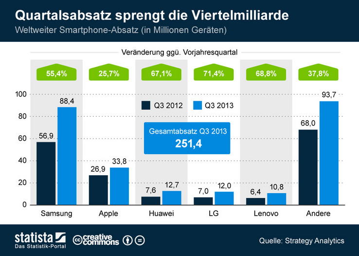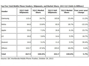 Bei den Zahlen von IDC ist der weltweite Markt für Smartphones für Q3/2013 im Vergleich zum Vorjahr um 38,8 Prozent auf 258,4 Millionen ausgelieferter Smartphones gestiegen. Das neue Rekordquartal toppt damit auch das schon hervorragende 2. Quartal 2013 (237 Millionen). Ebenso konnte der Gesamtmarkt bei den Mobiltelefonen deutlich zulegen: 467,9 Millionen Handys in Q3/2013 (442,7 Millionen Q3/2012) im Vergleich zu 437,4 Millionen im Vorquartal.