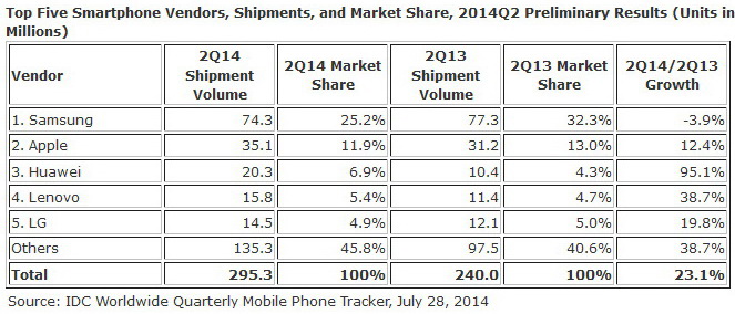 Für den südkoreanischen LG Electronics Konzern bleibt mit 14,5 Millionen (Q2/2013: 12,1 Mio.) und einem Marktanteil von nun 4,9 Prozent (Q2/2013: 5 %) Position 5. Die Verkäufe für das neue und sehr populäre Smartphone-Flaggschiff LG G3 werden sich IDC zufolge erst im 3. Quartal in den Absatzzahlen widerspiegeln.