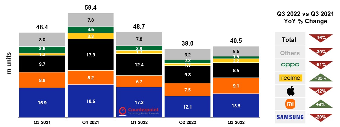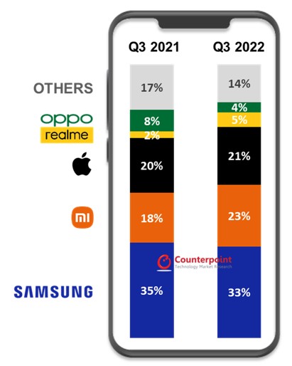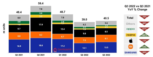 Apple verzeichnete im Jahresvergleich in Folge des Wegfalls des Russland-Geschäfts ebenfalls einen Rückgang, da zudem Lieferengpässe bei der neuen iPhone-14-Serie einige Lieferungen bis ins vierte Quartal verzögern. Dank dem Smartphone-Absatz von Realme in Russland überholte die Handymarke von BBK Electronics die Schwestermarke Oppo als viertgrößter Smartphone-Anbieter in Europa.