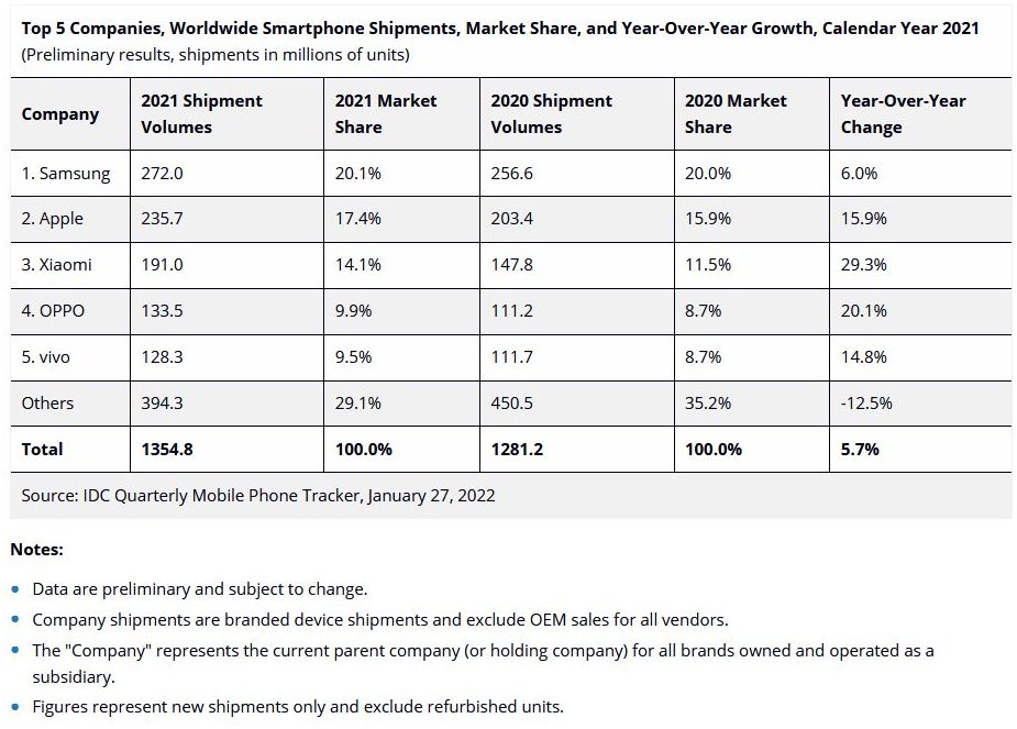 Im Gesamtjahr 2021 konnten die fünf größten Smartphone-Hersteller Samsung, Apple, Xiaomi, Oppo und Vivo ihre Lieferungen im Vergleich zum Vorjahr steigern. Bis auf Samsung konnten Apple und Co. ein zweistelliges Wachstum erzielten. Während Xiaomi mit fast 30 Prozent das höchste jährliche Wachstum verzeichnen konnte, musste sich Samsung mit lediglich 6,0 Prozent zufrieden geben. IDC bewertet die Zahlen für den Smartphone-Markt angesichts der Chipkrise und Komponentenknappheit sehr optimistisch. Die Ergebnisse seien ein Zeichen dafür, dass es in fast allen Regionen einen erheblichen Nachholbedarf gebe.