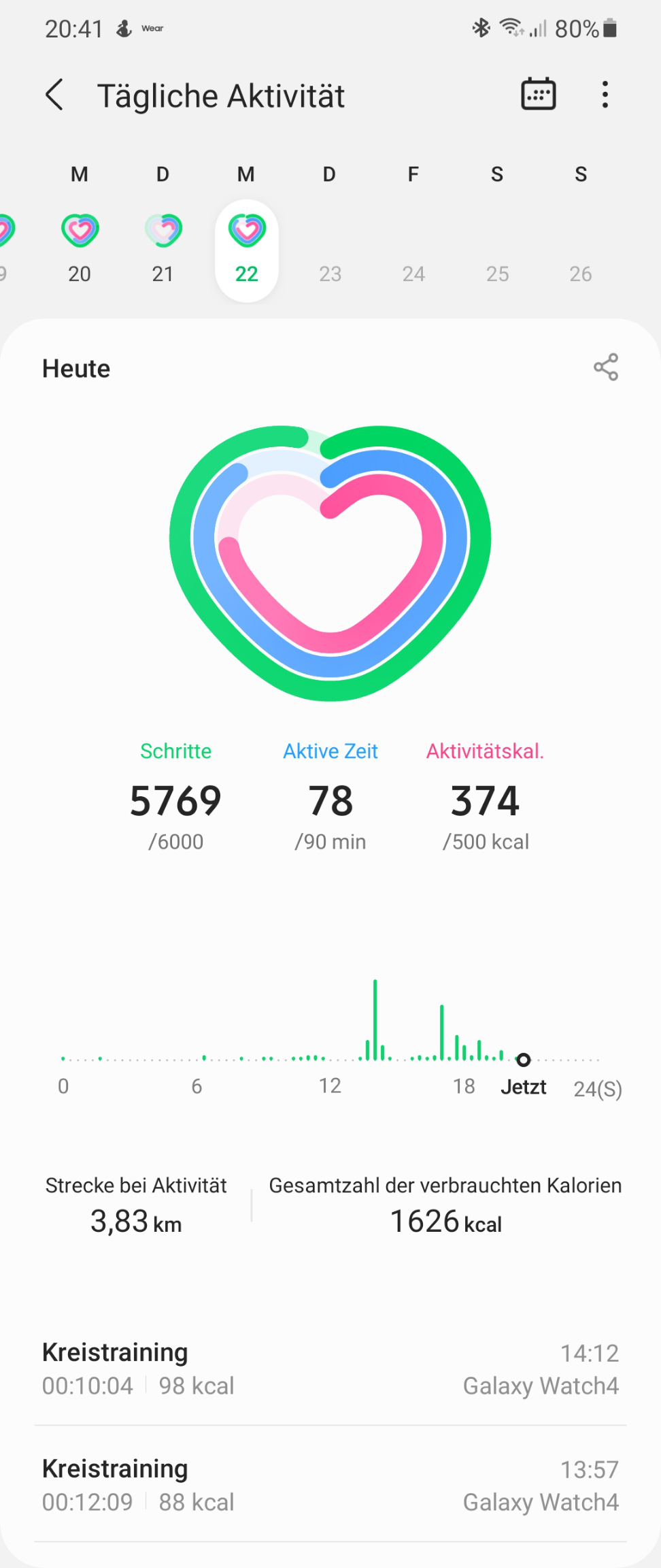 Die Anleitung im Rahmen der Health-App macht hierzu keine Angaben. Daher haben wir die Galaxy Watch4 nach Ende des Tests noch einmal am nicht dominanten Handgelenk kalibriert, an dem sie auch im Alltag sitzt. Anschließend glichen sich die durch die Galaxy Watch4 gemessenen Werte für den systolischen und diastolischen Blutdruck besser an die Messung mit einer Oberarmmanschette an: