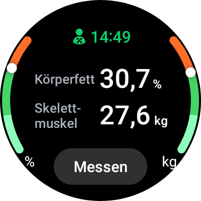 Ähnlich wie moderne Körperfettwaagen analysiert Samsung bei Bedarf die Zusammensetzung des Oberkörpers. Darauf aufbauend und in Verbindung mit den persönlichen Angaben ermittelt Samsung den BMI und die Körperzusammensetzung hinsichtlich Körperwasser, Skelettmuskeln sowie Fettmasse und anteiligem Körperfett. Die Messung über Fingerkuppen und Handgelenk ist für diese Analyse nicht ideal; und so weist Samsung auch darauf hin, dass die Ergebnisse gegebenenfalls ungenau sind.