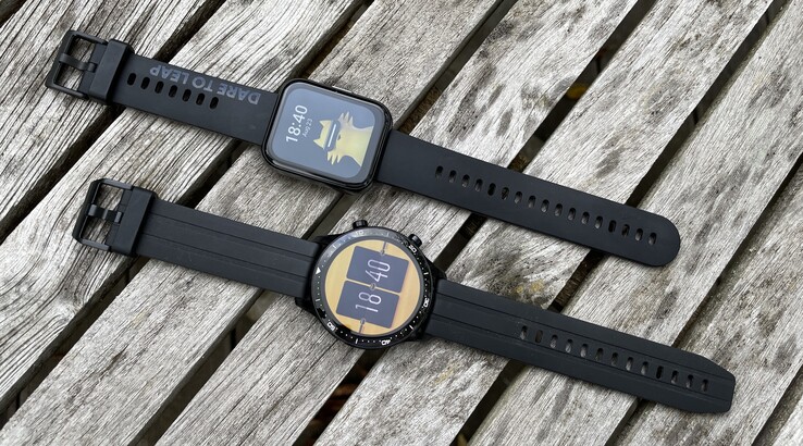 Die Watch S Pro ist eine runde Smartwatch mit skalierter Lünette, die Watch 2 Pro folgt der von Apple begründeten rechteckigen Bauform. Darüber hinaus fallen bereits beim Design weitere Unterschiede auf: Während die Watch 2 Pro nur eine Taste zum Bedienen hat, besitzt die Watch S Pro zwei, von denen die untere allerdings fest der Trainings-App zugeordnet ist. Die Bänder sind bei beiden aus Silikon, doch nur bei der Watch 2 Pro setzt realme mit dem Slogan "Dare to Leap" einen Akzent. Übersetzt bedeutet er soviel wie "Wage den Sprung"; eine Motivation, etwas Neues auszuprobieren.