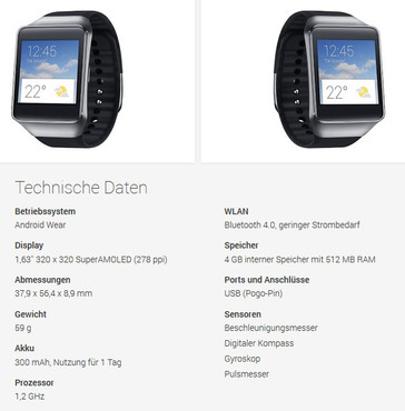 Technische Spezifikationen Smartwatch Samsung Gear Live (lt. Hersteller):
