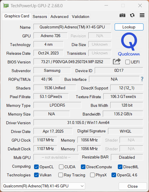 | Samsung Galaxy Book4 Edge 15 Qualcomm Snapdragon X Plus X1P-42-100 ⎘ Qualcomm SD X Adreno X1-45 1.7 TFLOPS ⎘ 16 GB RAM, 256 GB | Amazon: Bestpreis 649€ galaxus 2. 649€ computeruniverse.net 3. 649€ Cyberport Stores Deutschland | 1.5 kg | 15 mm | 15.60" 1920x1080 141 PPI IPS | |