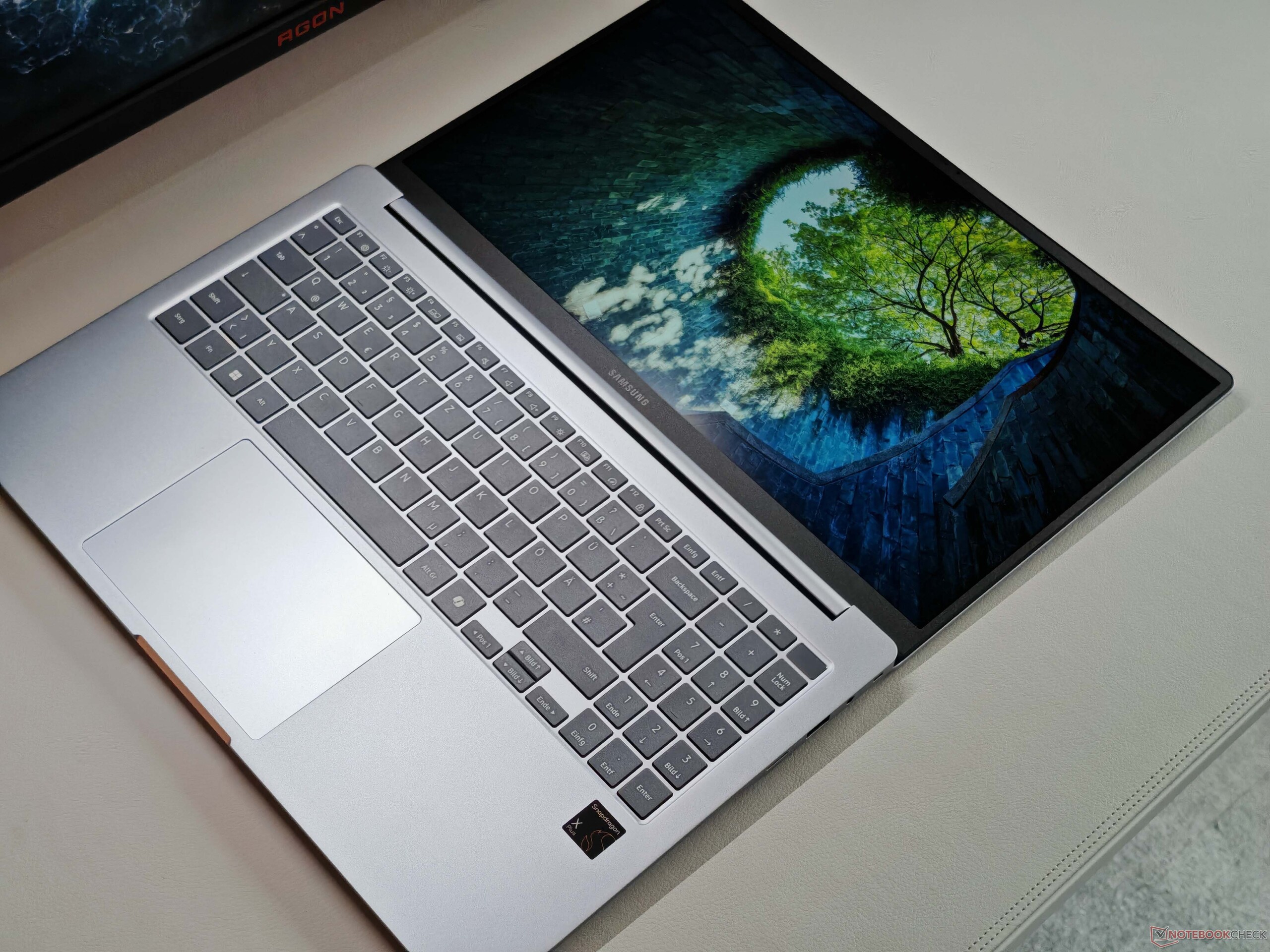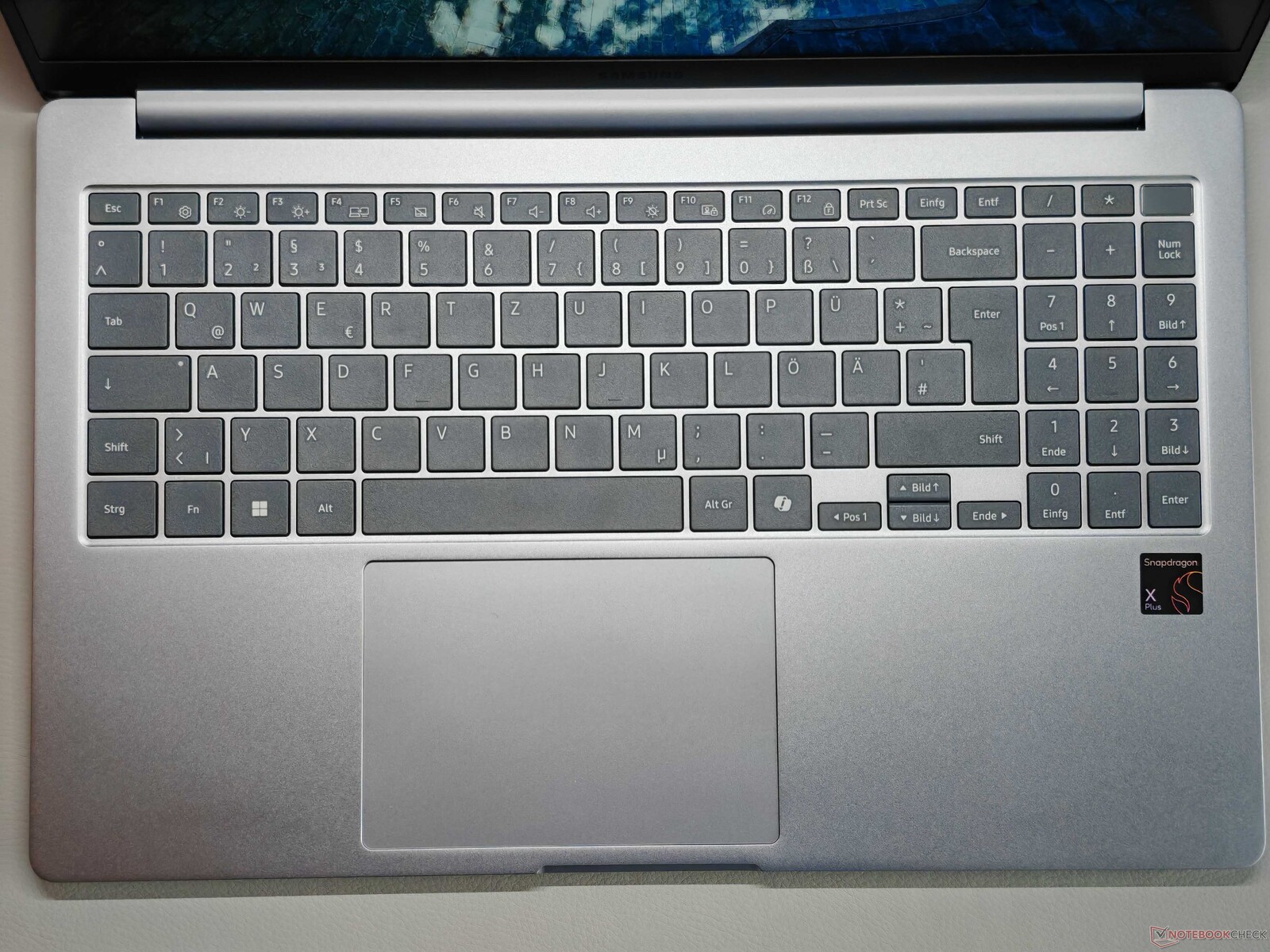 Die große Tastatur beinhaltet einen Nummernblock und präzise Anschläge. Typisch für die Galaxy-Book-Reihe ist jedoch der seichte Tastenhub, weshalb man die Tastatur im Vorfeld ausprobieren sollte. Beim Layout muss man sich an die kleinen Pfeiltasten sowie den Power-Button (inkl. Fingerabdruckscanner) oben rechts gewöhnen, wo man eigentlich die Entf-Taste erwartet. Das größte Problem ist jedoch das Fehlen einer Hintergrundbeleuchtung, was für einige Nutzer ein Ausschlusskriterium sein dürfte.