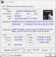 Der Qualcomm Snapdragon X1P-42-100 bietet 8 Kerne mit einem maximalen Takt von 3,4 GHz. Den CPU-Boost der teureren Modelle unterstützt der X1P-42-100 aber nicht. Der Stromverbrauch der Snapdragon-Prozessoren lässt sich weiterhin nicht auslesen. Basierend auf unseren Verbrauchsmessungen dürfte die CPU jedoch um die 35 Watt (später 30 Watt) verbrauchen. Bei kombinierter CPU/GPU-Last sind es ~40-45 Watt.
