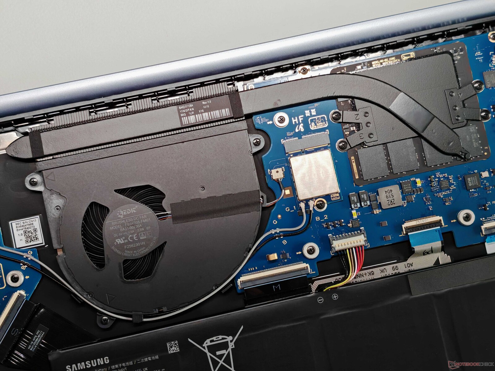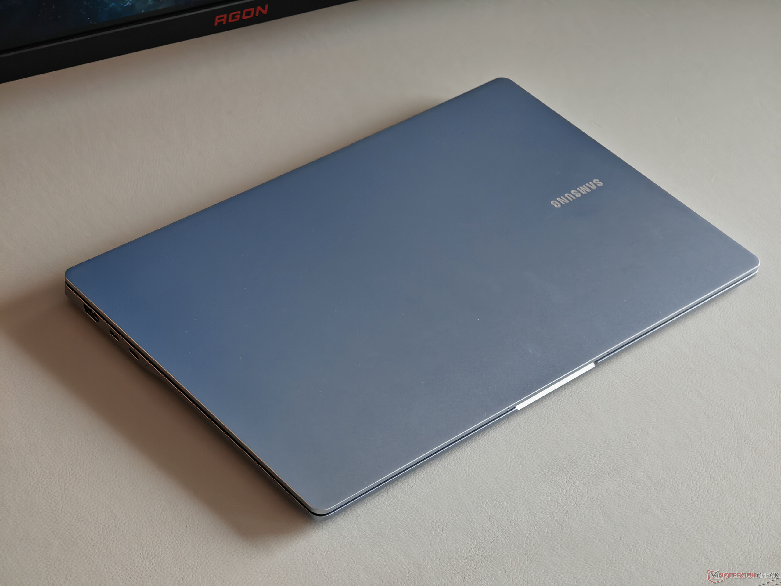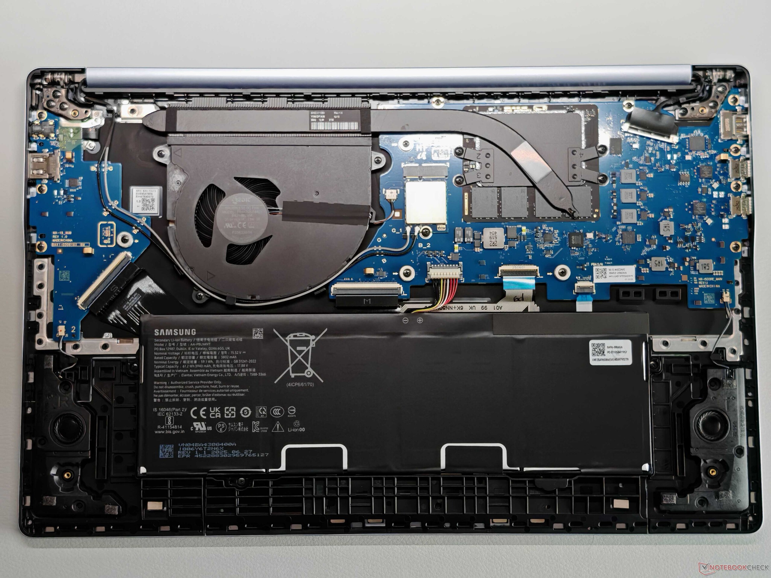 Samsung verwendet ein schlankes Metallgehäuse für das Galaxy Book4 Edge, das mit 1,5 cm Höhe und einem Gewicht von 1,49 Kg problemlos in jeden Rucksack passt. Die Gehäusefarbe ist Sapphire Blue, wobei es sich hier um einen sehr hellen Blauton handelt (eher Silber mit leichten Blaustich). Optisch macht das Notebook eine Menge her und auch die Qualität passt. Lediglich das Displayscharnier (max. Öffnungswinkel 180 Grad) ist etwas zu leichtgängig und wippt daher ein wenig nach. Die untere Gehäuseabdeckung kann entfernt werden (Schrauben unter den gesteckten Gummifüßen), die Wartungsmöglichkeiten beschränken sich aber auf die Reinigung des Lüfters sowie as WLAN-Modul und den Akku, die bei Bedarf getauscht werden können.
