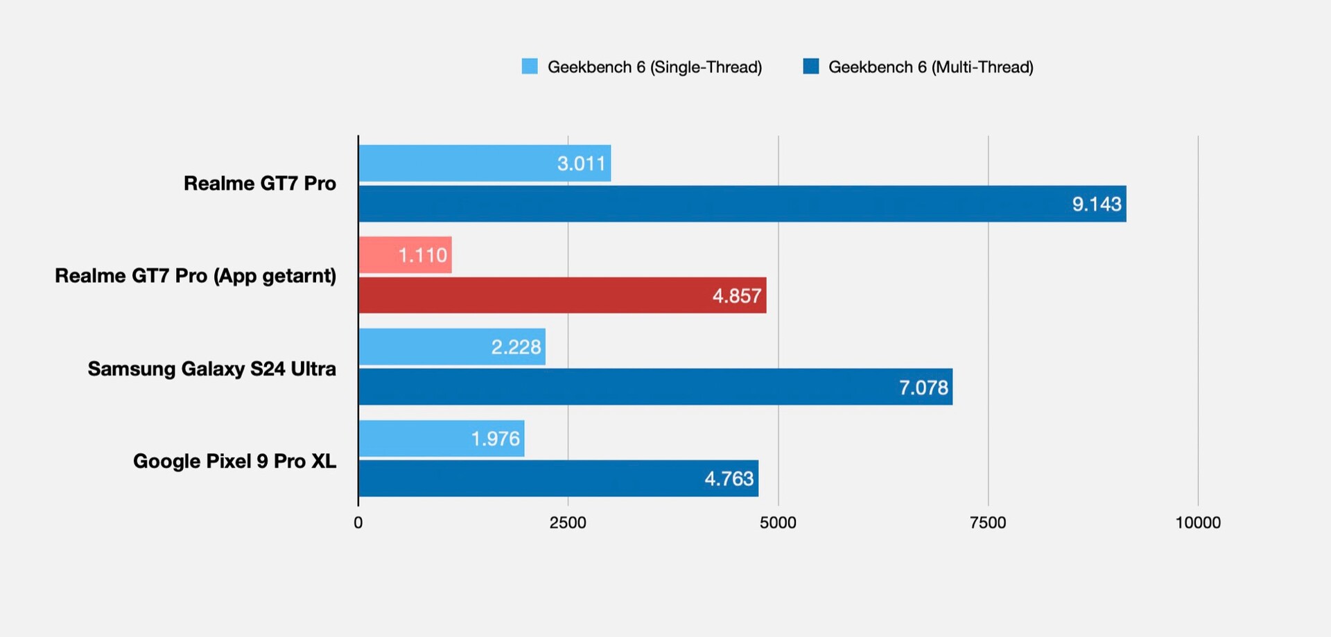 Doch während die GPU-Leistung passabel bleibt, zeigt sich im Geekbench 6 CPU-Benchmark ein anderes Bild. Erkennt das Realme GT7 Pro, dass Geekbench 6 läuft, erzielt das Smartphone 3.011 Punkte (Single-Thread) respektive 9.143 Punkte (Multi-Thread), wird die App unter anderem Namen ausgeführt, sinkt das Resultat auf 1.110 Punkte respektive 4.857 Punkte, und fällt damit bis zu 63 Prozent schlechter aus. Schlimmer noch: Selbst der Snapdragon 8 Gen 3 kommt im Schnitt auf 2.222 Punkte respektive 6.804 Punkte, ohne die "Performance-Optimierungen" ist das Realme GT7 Pro mit Snapdragon 8 Elite also wesentlich langsamer als ältere Flaggschiffe.