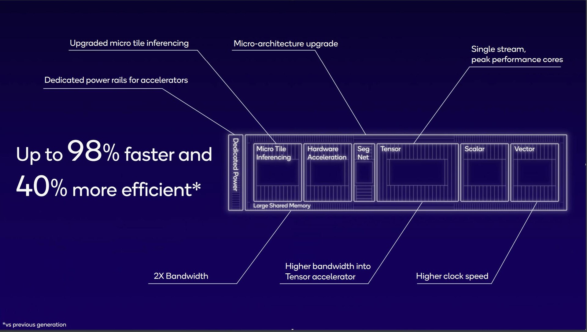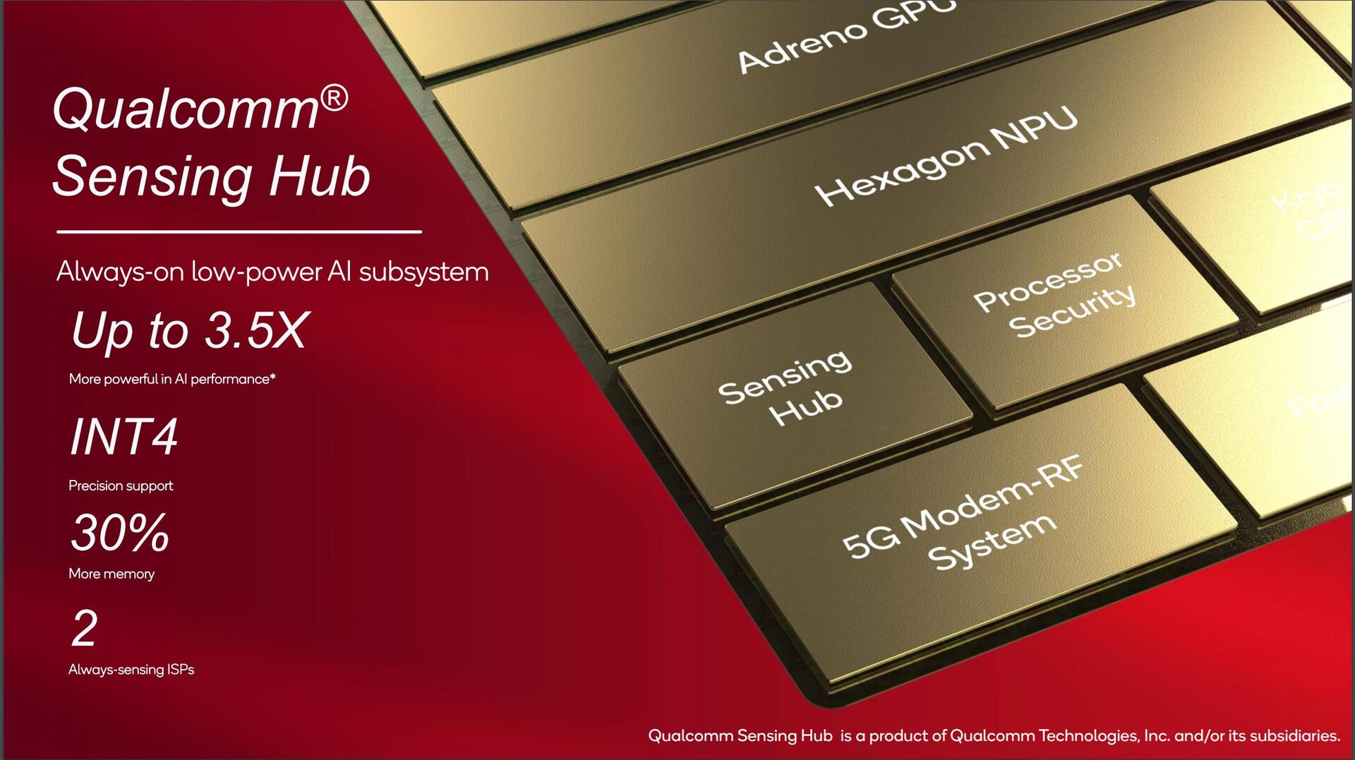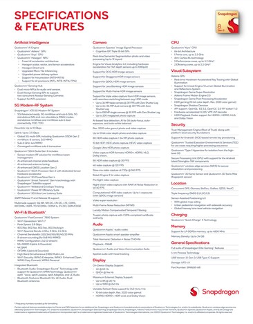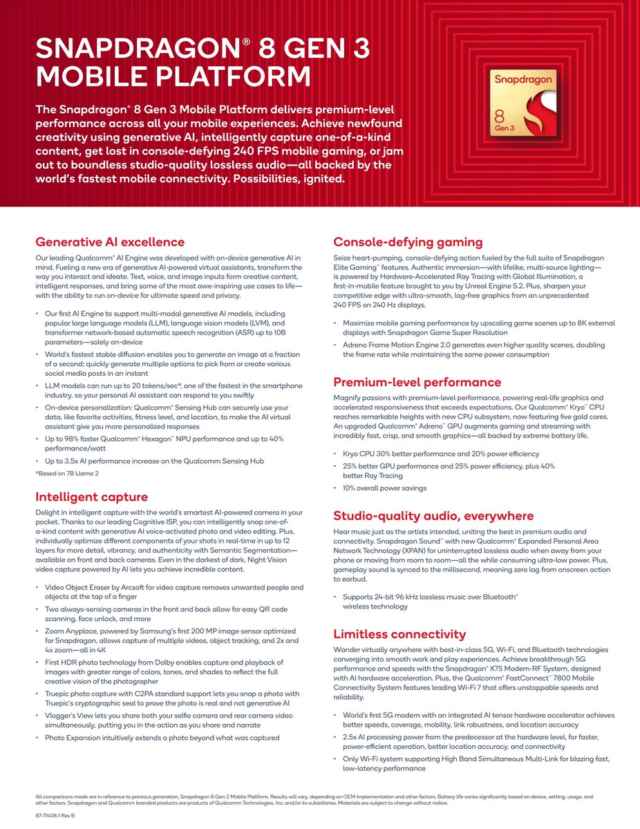 Bei der neuen Octacore-CPU bestehend aus 3,3 Ghz Prime-Core auf ARMs Cortex-X4-Basis, drei Performance-Cores mit 3,2 Ghz, zwei weiteren Performance-Cores mit 3 Ghz und zwei Effizienz-Kernen mit 2,3 Ghz sollen bis zu 30 Prozent mehr Leistung drin sein, bei 20 Prozent mehr Energie-Effizienz. All diese Verbesserungen werden aber von den Zahlen bei Qualcomms Hexagon NPU und dem Sensing-Hub in den Schatten gestellt.